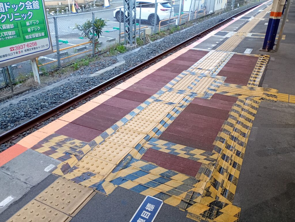 ホームには様々な色のテープが貼ってあるのですが、ホームゲート工事に向けた準備なのですかね。現在はホームゲートがないので普通に乗車していますが、あと1年後はホームゲートが設置され、乗客の安全面での配慮がグッと高まりそうですね。