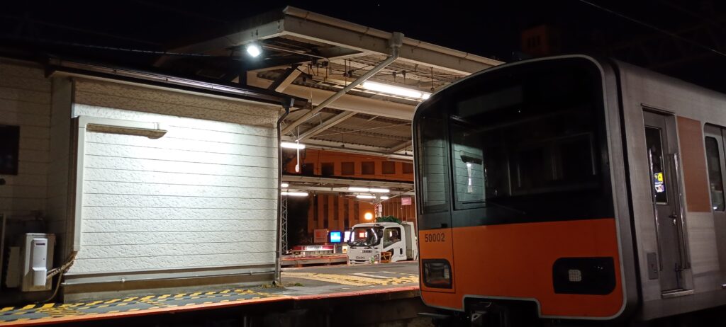 2025年7月初旬、始発前にもかかわらず下り車両が成増駅に停車しており、登り車両にも車両はあるのですが、どうやらトラックが停まっており工事をしていました。ホームドア設置工事ですかね。