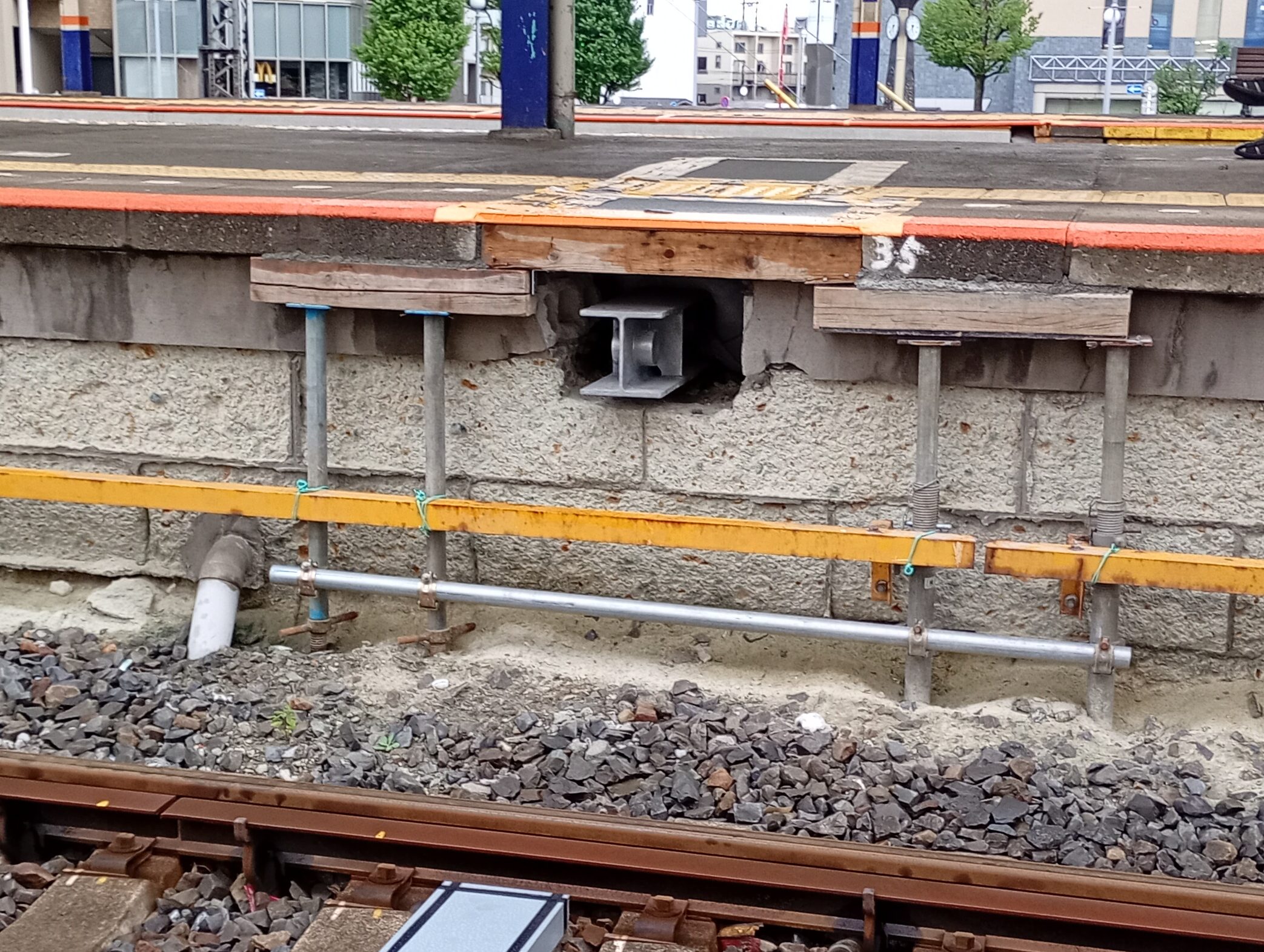 ホーム下に金属の金具が設置されていました。ホームドアを固定する器具でしょうか。