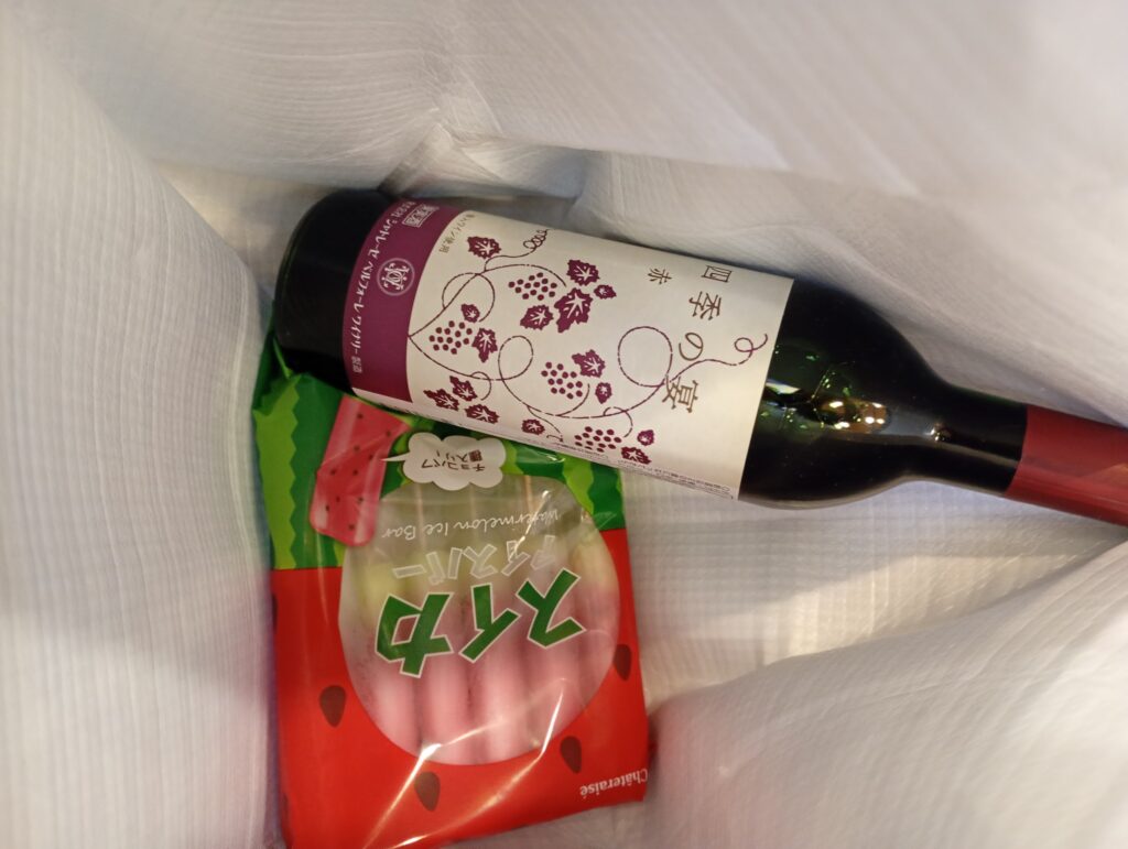 スイカのアイスとワインを購入してきました。ワインは1,100円でしたが、甘くなく、辛くなく、スッキリした味わいで飲みやすいです。