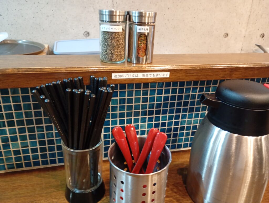 レンゲやブラックペッパーや柚子七味等がテーブルにおいてあります。