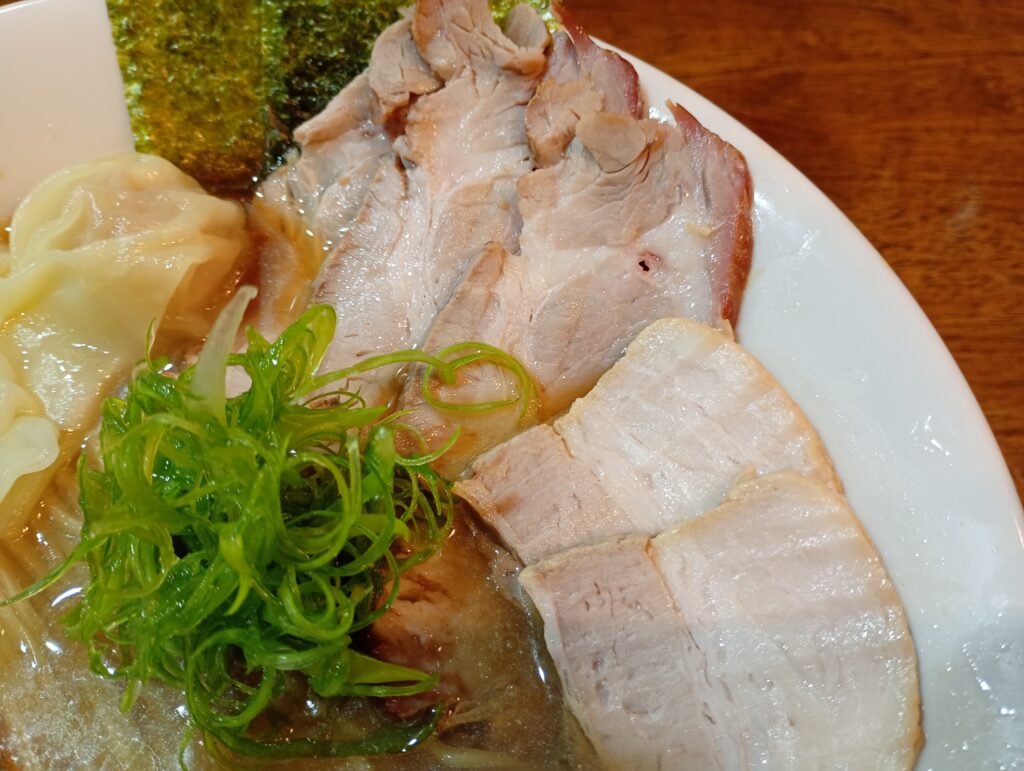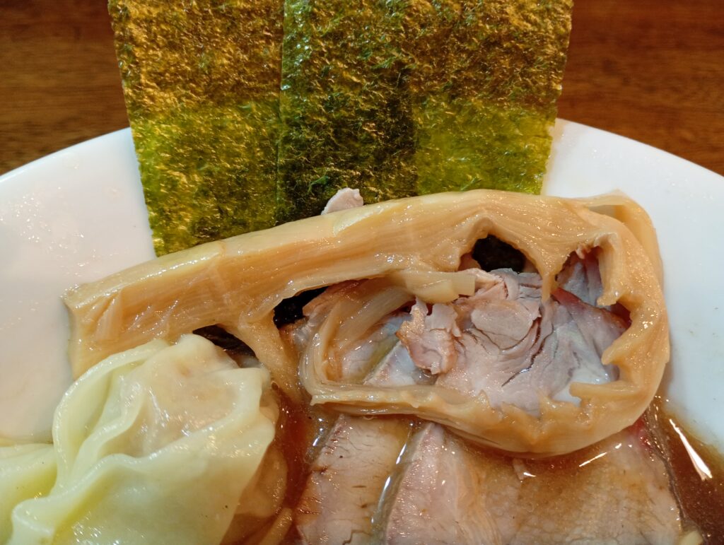 チャーシューは肩ロースが2枚と豚バラが2枚入っていました。2つの味わいがあるのはありがたいです。はじめに脂っこいバラを食べ、ついで肩ロースを食べたのですが、しっかりした味わいでした。