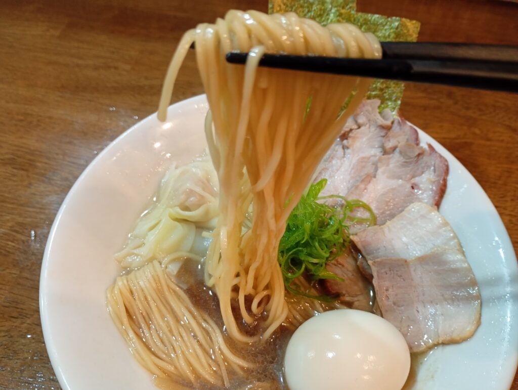 麺は菅野製麺所のツルツルの細麺です。スープと絡んで、少し油がテカテカしていますね。