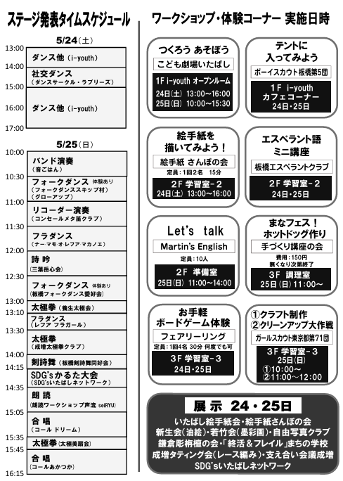 2025年24、25日まなぽーと成増にて「まなぽーと成増フェスタ2025」が開催されます。ステージでは合唱やダンスなどの発表、創作系のサークルは作品の展示、またお子さんも参加できるワークショップもあるそうです。