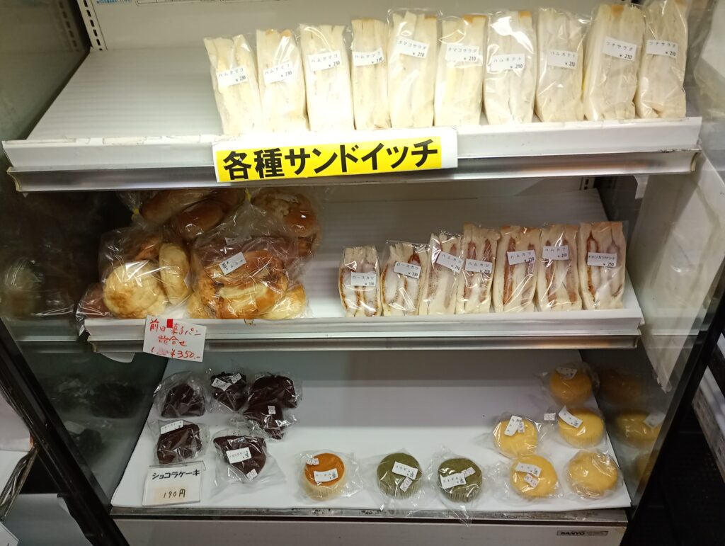 サンドイッチやケーキ類もあり、また、前日菓子パンの詰め合わせ350円も人気です。懐かしのチーズドッグなんかもあります。
