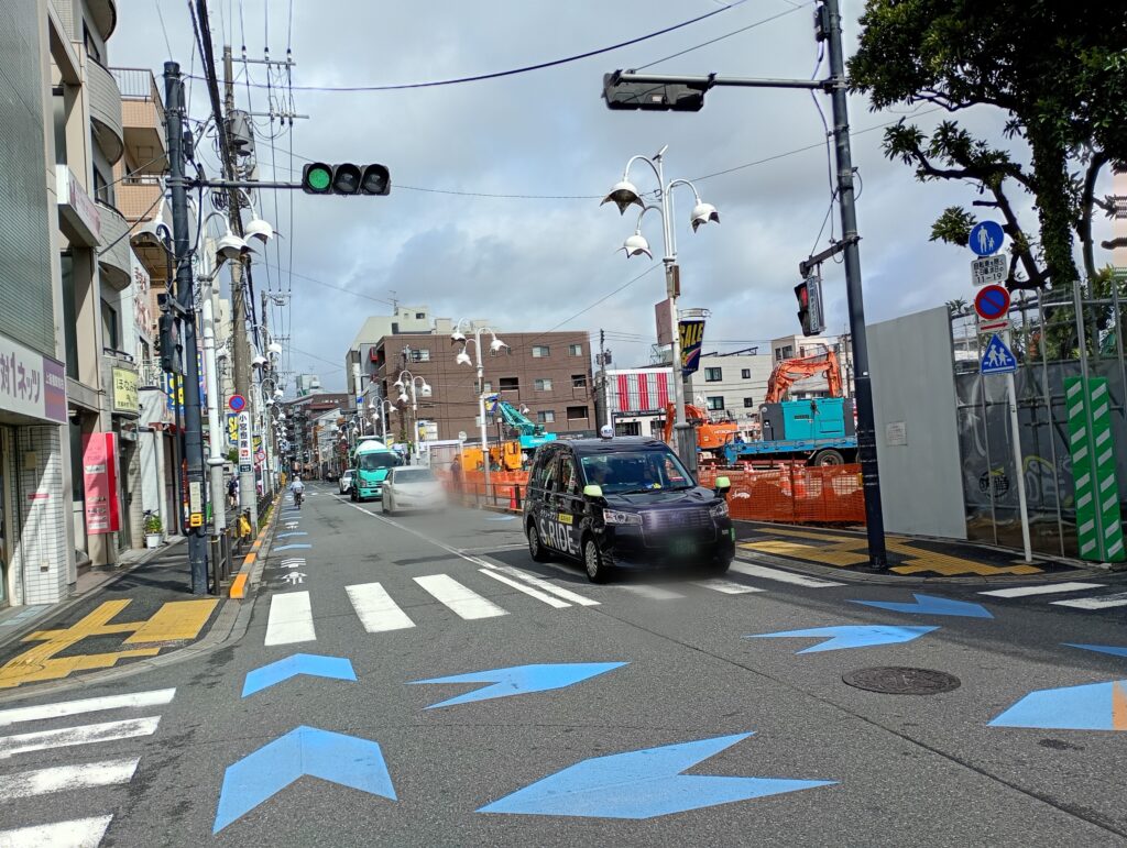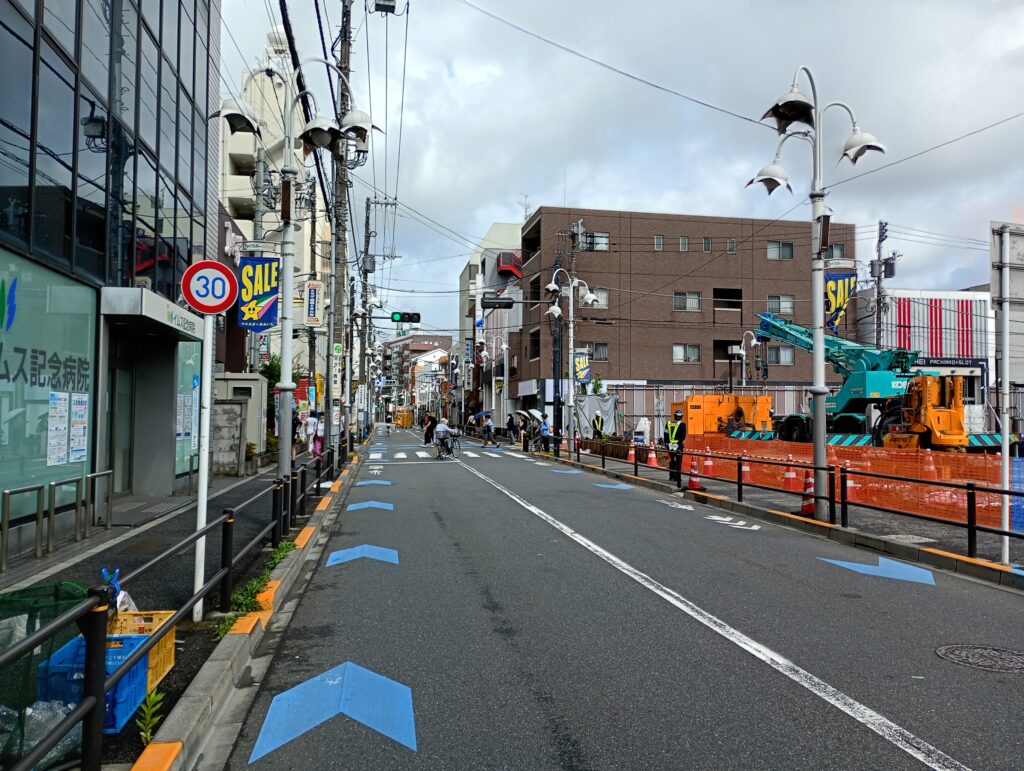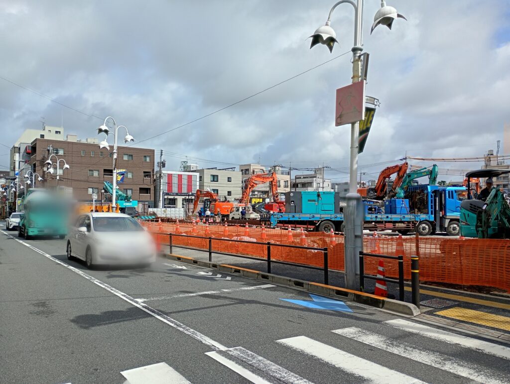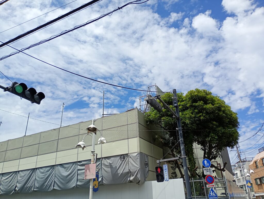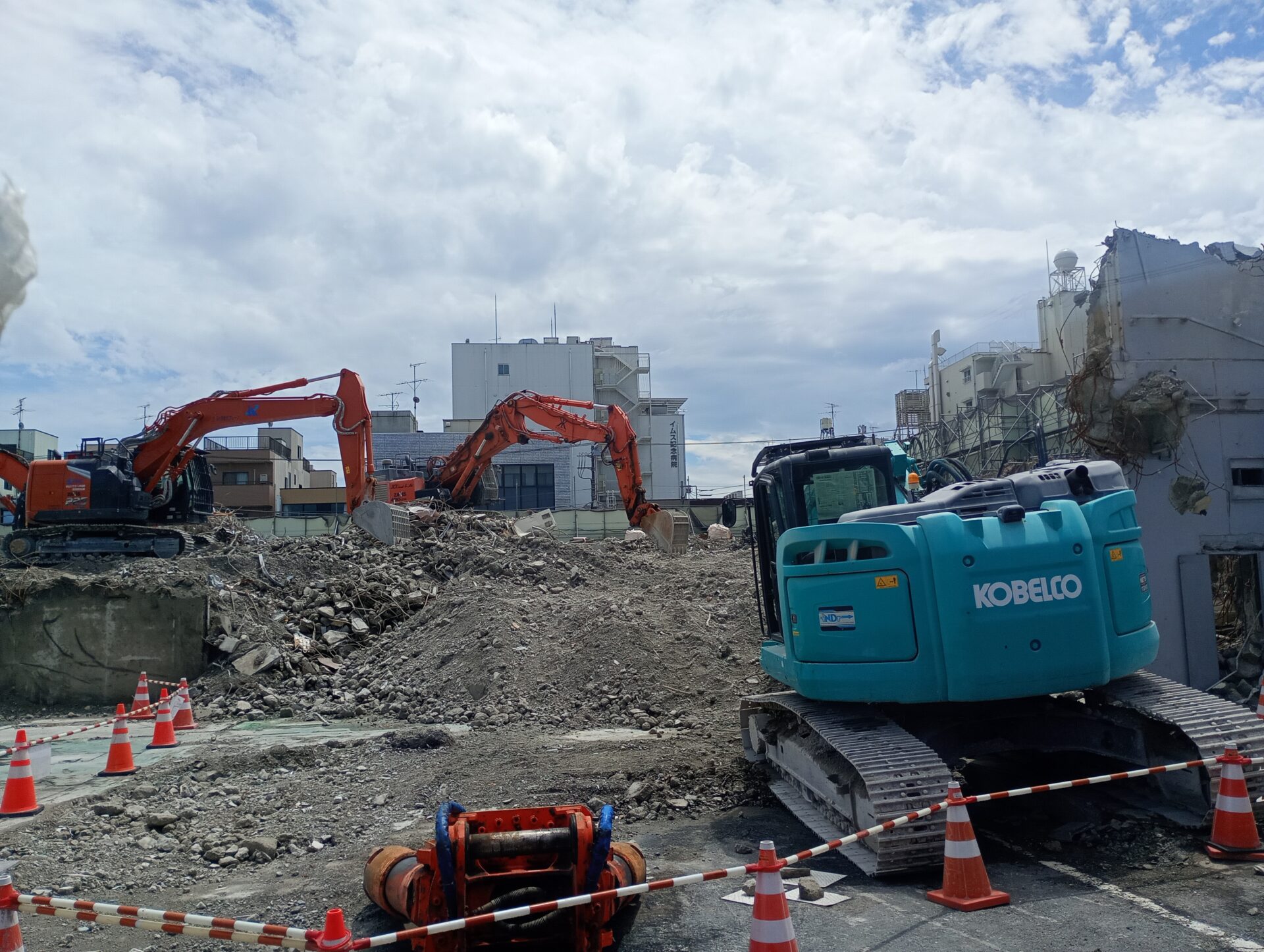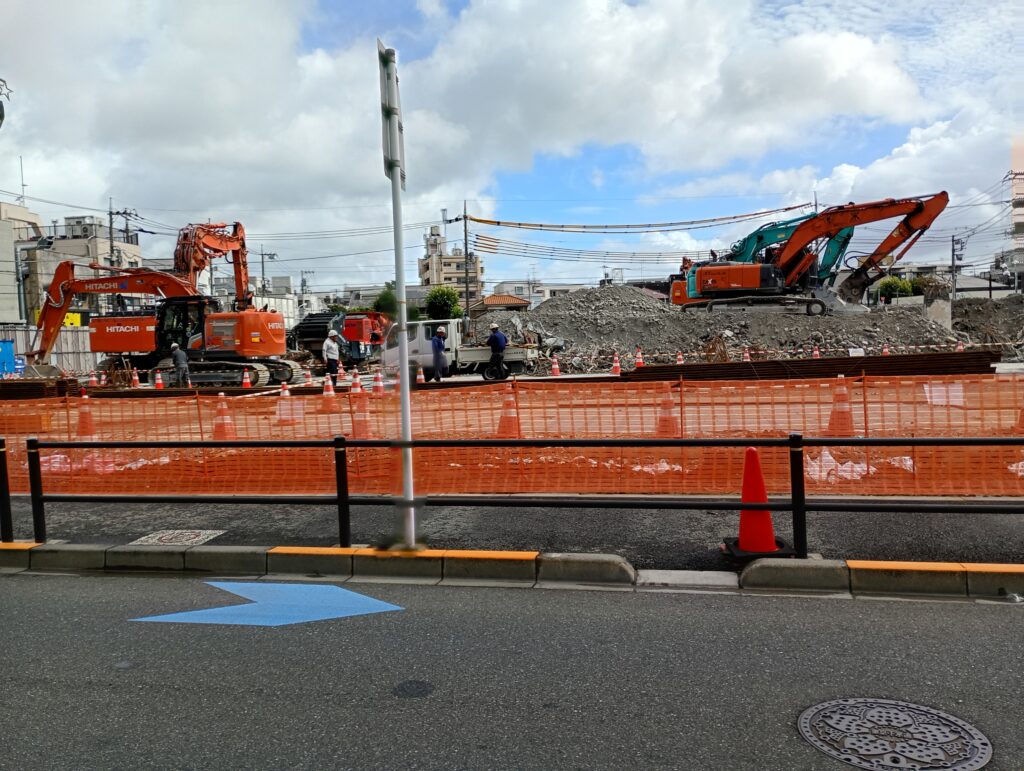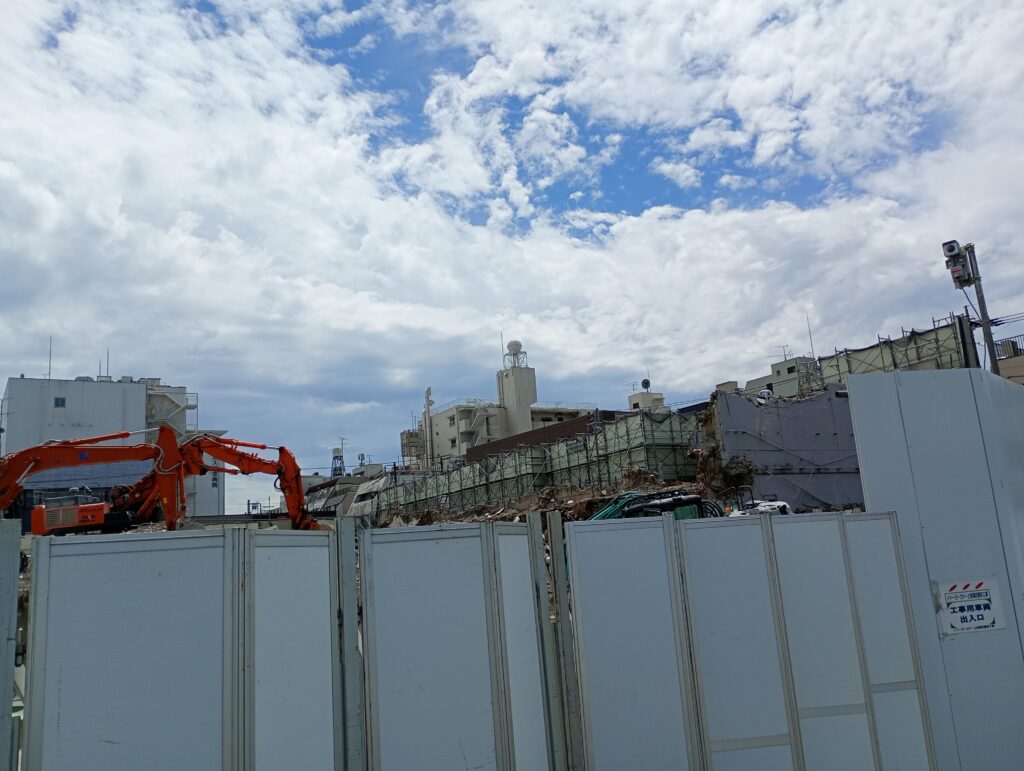 商店街の裏側に回ると解体工事の様子が見えるようになっていました。大きな建物がおおかた取り壊されており、ショベルカーが忙しなく作業をしています。心なしか空が青さが濃い気がします。