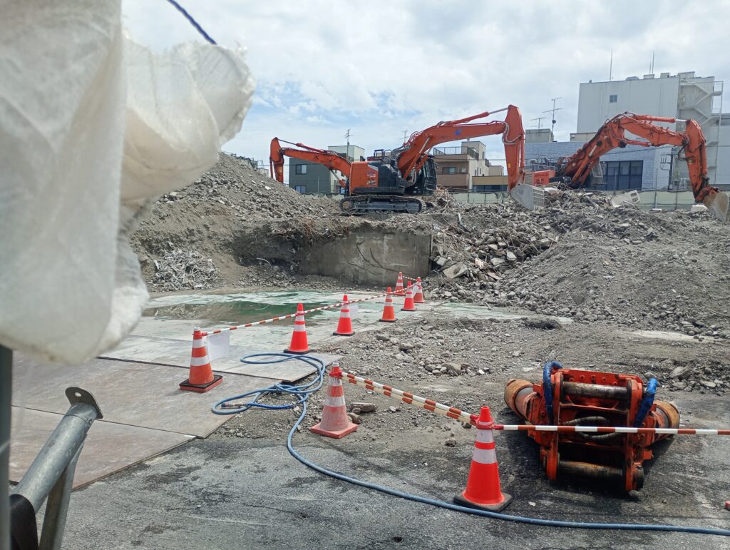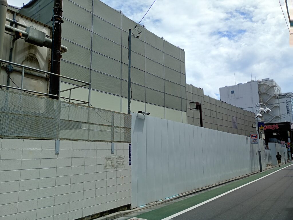 車通りの多い商店会に面していることもあり、防音や防塵対策がしっかりされたフェンスの内側で解体工事が行われています。