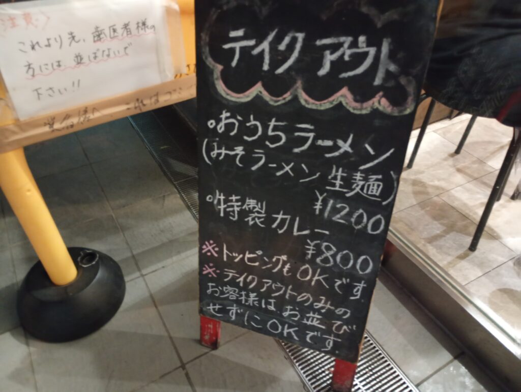 テイクアウトもやってらっしゃるそうで、「おうちラーメン」1,200円、「特製カレー」800円はお持ち帰りできるみたいです。実際にお店の入口にお持ち帰り待ちのお客さんがいらっしゃいました。