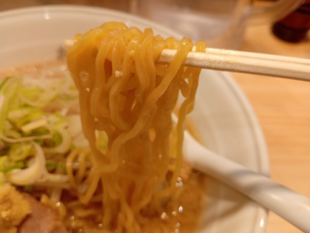 麺は、札幌の老舗製麺所「森住製麺」から取り寄せる、黄色みがかった多加水の中太縮れ麺。プリプリとした弾力と歯ごたえが特徴で、濃厚な味噌スープと見事に絡み合います。