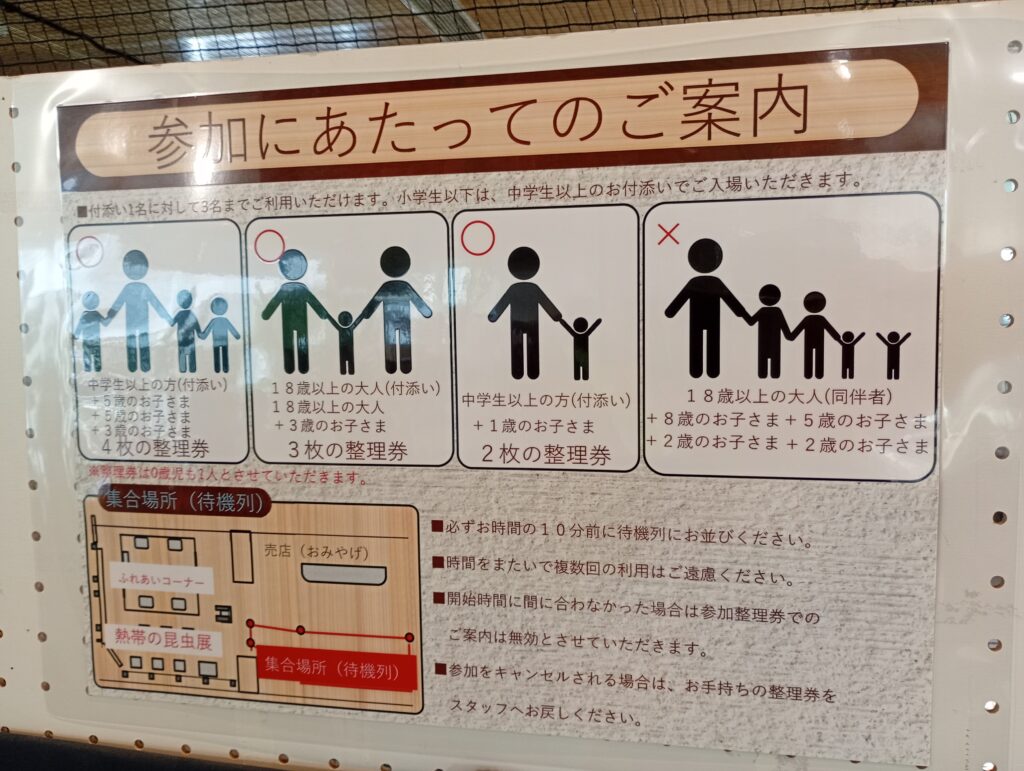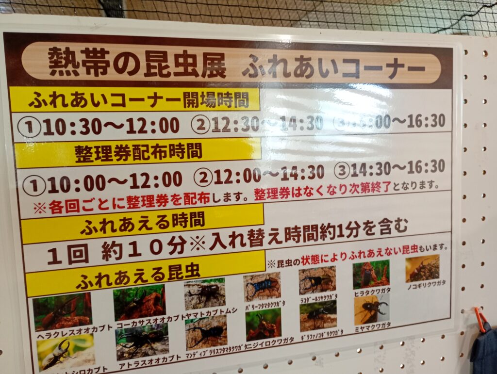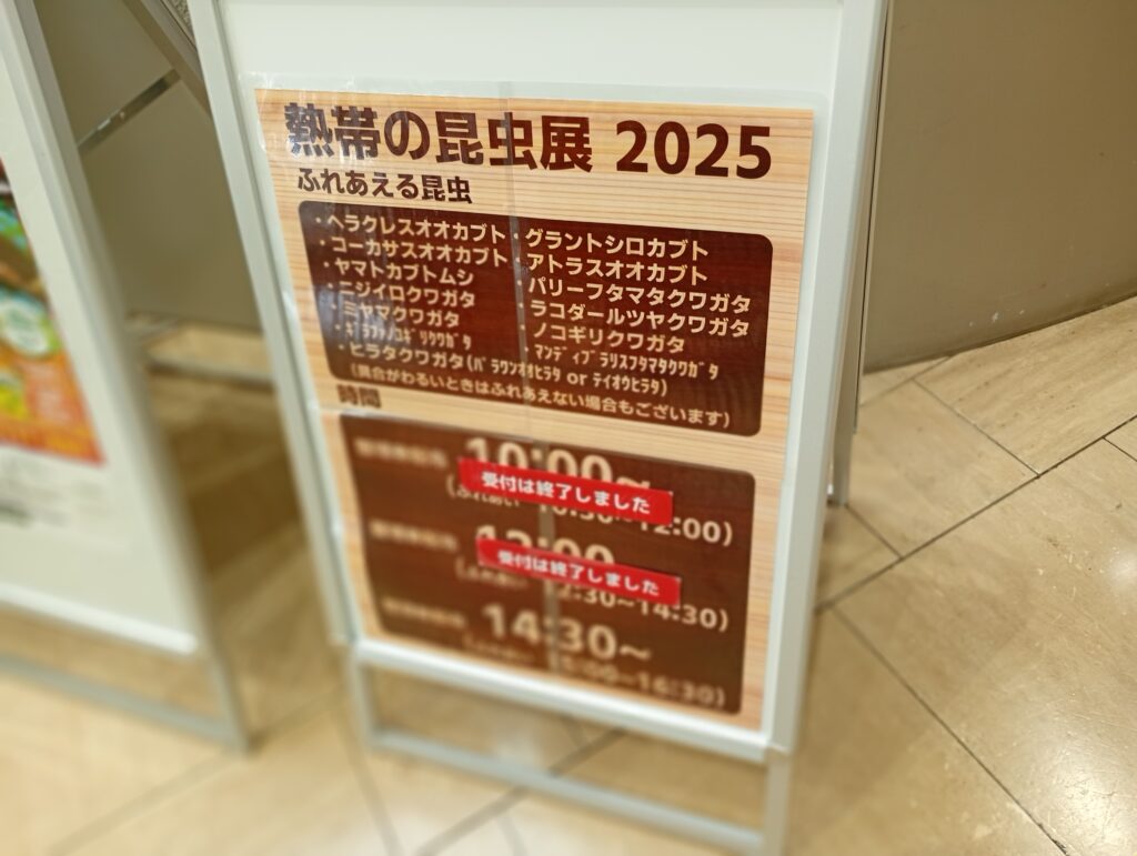 入口には熱帯の昆虫展2025の掲示が出ていました。1日3部制で各回2時間ずつ(十分入れ替え制)昆虫に触れ合う時間が設けられています。