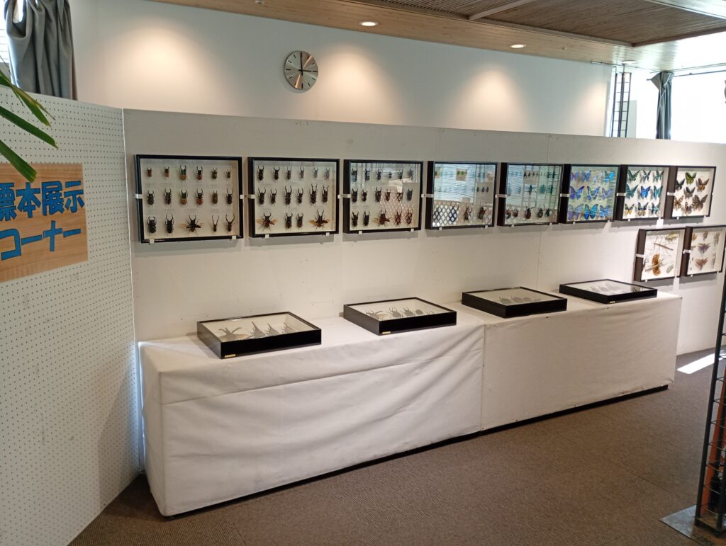 展示は3つあり、まずは標本展示コーナーがあります。標本展示では、美しいモルフォチョウ、大きなトリバネアゲハ、木の枝や葉にそっくりなナナフシやコノハムシ、巨大なカミキリムシやハナムグリなど、多種多様な熱帯昆虫の貴重な標本が展示されます。