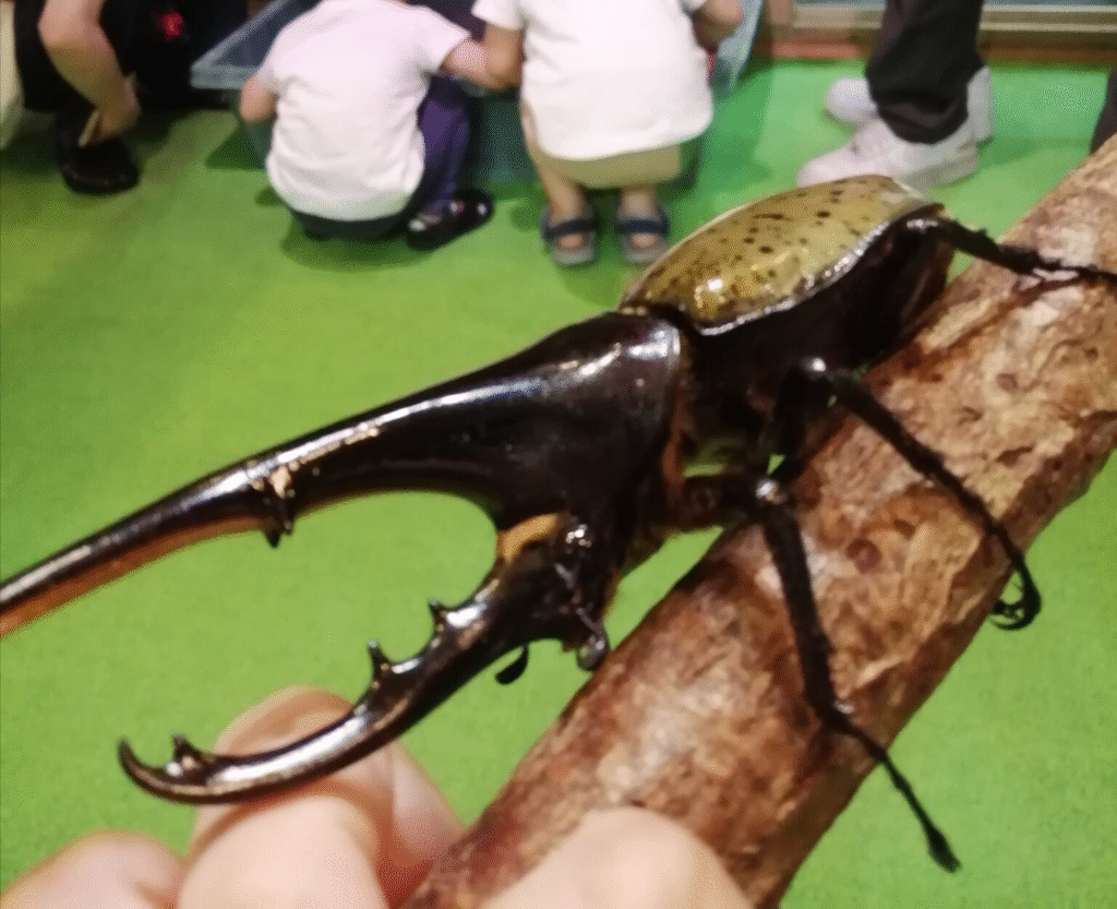 さいごに、昆虫とふれあいコーナーでは、ヘラクレスオオカブト、コーカサスオオカブト、ギラファノコギリクワガタ、マンディブラリスフタマタクワガタ、ニジイロクワガタ、パリーフタマタクワガタ、ヒラタクワガタ、ミヤマクワガタなどの大型甲虫と直接触れ合うことができます。