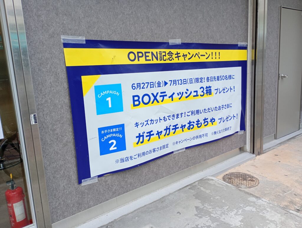 6月27日㈮にオープンしましたが、7月13日㈰までは来店時にBOXティッシュ3箱とキッズカット向けのガチャガチャの特典があるみたいです!