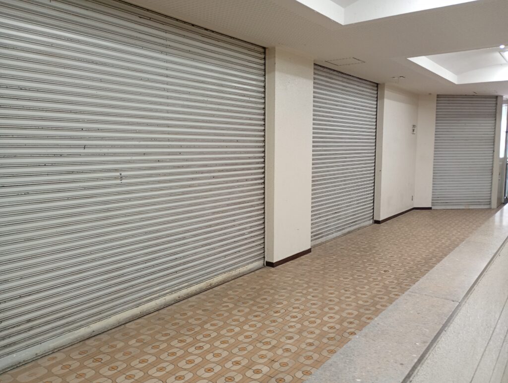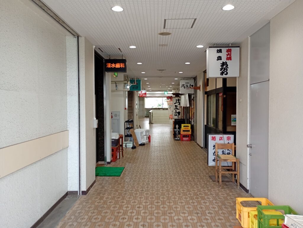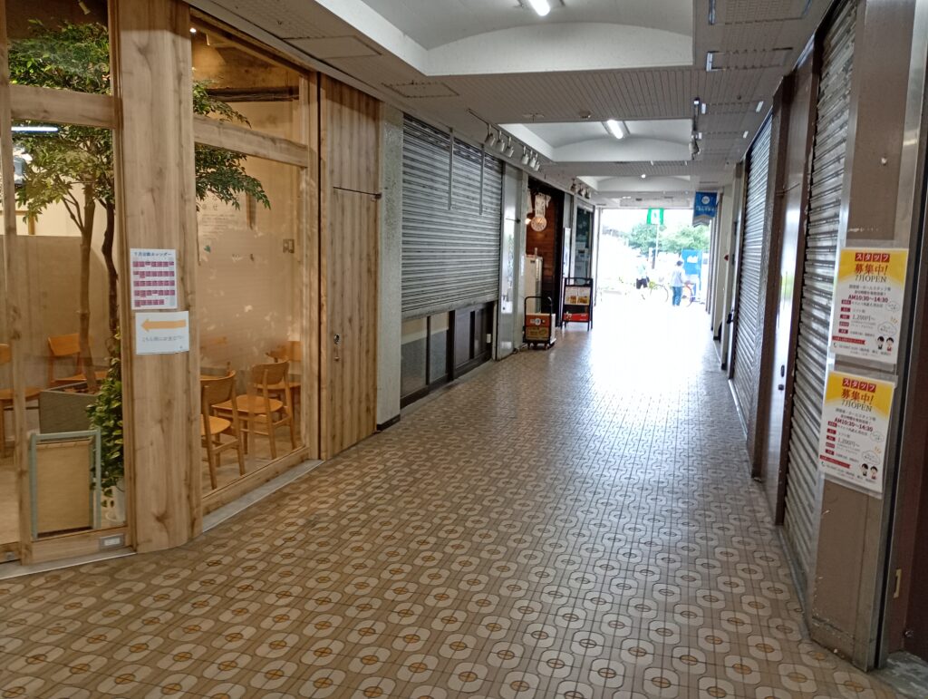 中に一歩踏み入れると少し雰囲気が変わり、お店がたくさん並んでいます。お蕎麦屋さんやからあげ屋さん、洋服屋さん(セルフレジ)が並んでいたりと、多様性に富んだテナントさんが並んでいます。