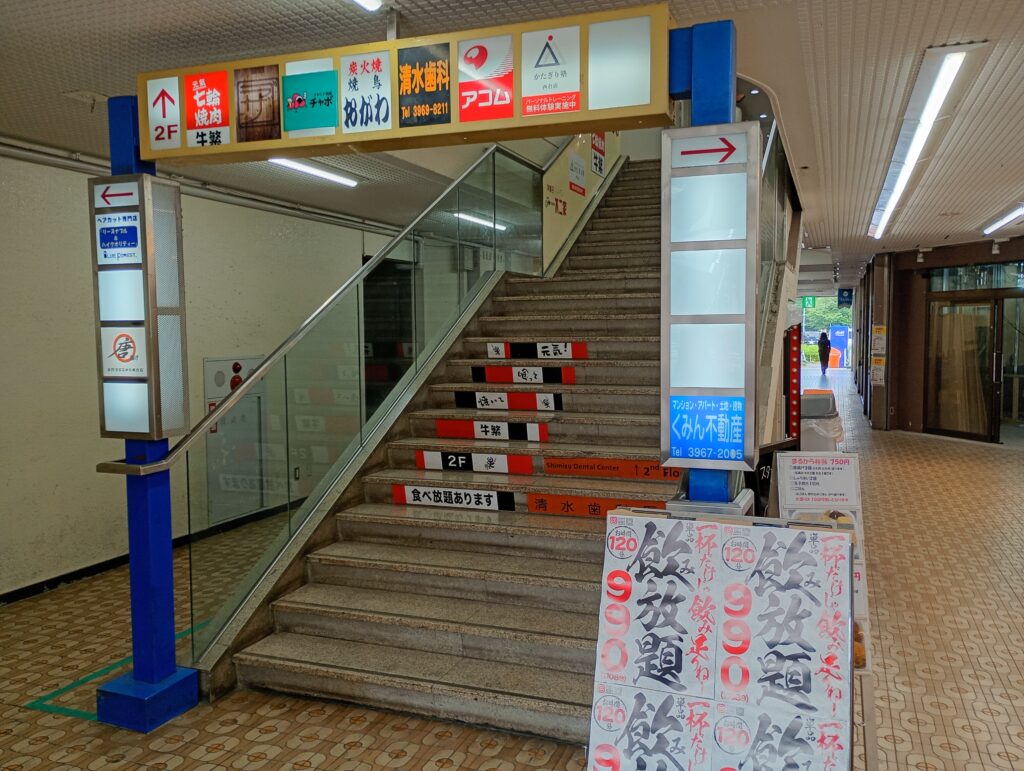 シャッターがありましたが、ここは場所的には森塾さんですかね。表階段から入るので、学生さんは2階には入らない構造になっているのですかね。2階へ続く建物中央の階段は、さながら大人の階段ということでしょうか。