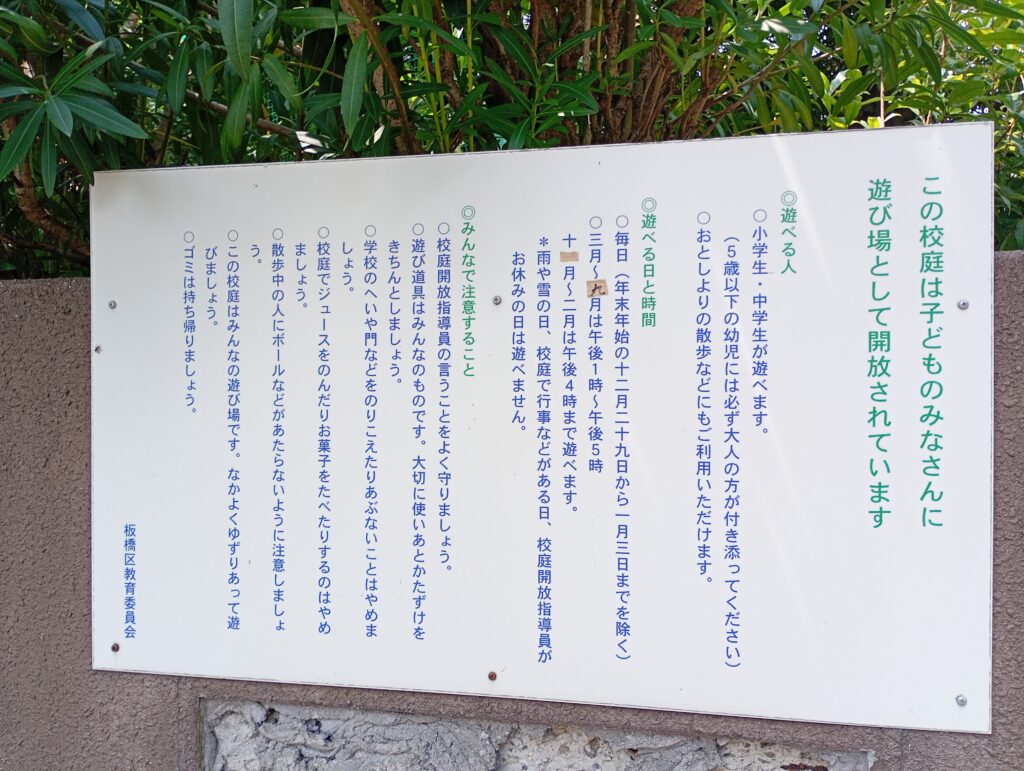 高島平第七小学校の校庭や校舎の一部は地域の方々が利用できるようになっています。お子さんが遊んだり、おとしよりの散策に利用できると記載されていますが、青年や壮年の方々も散策することができます。