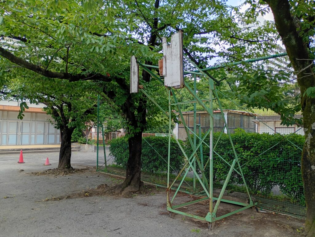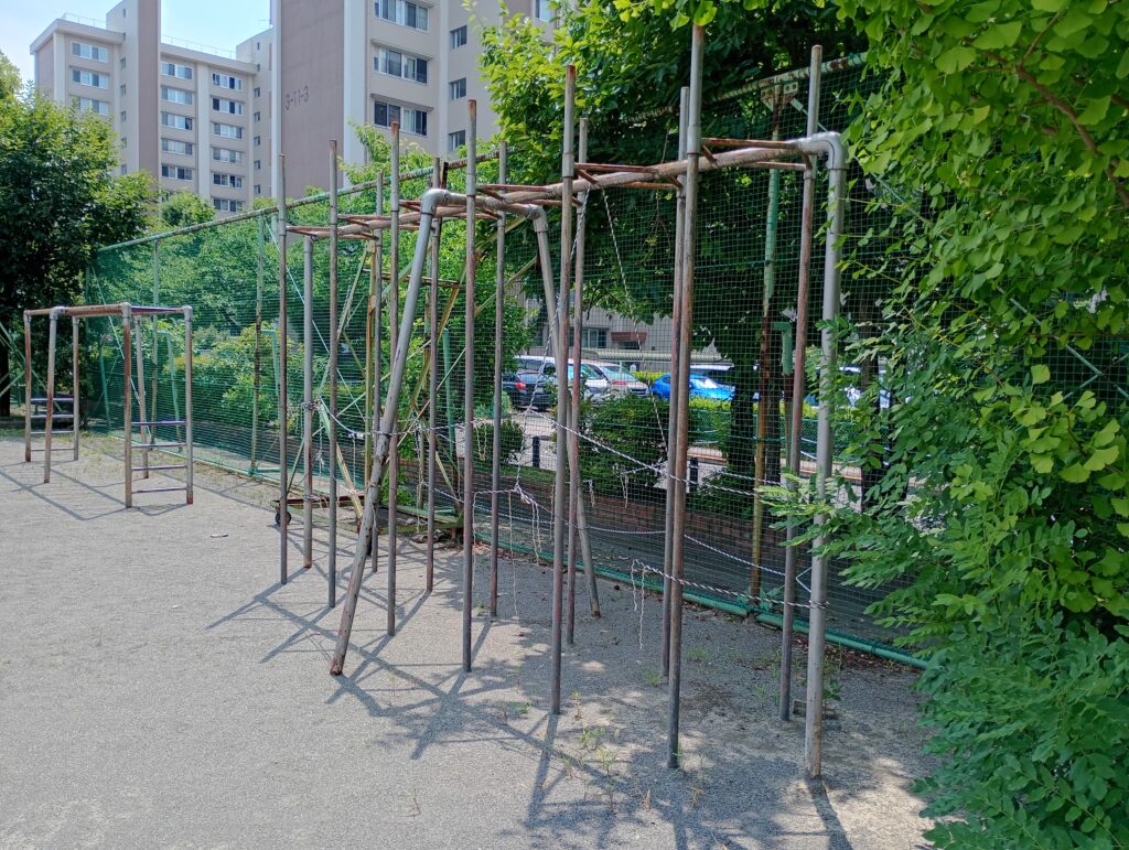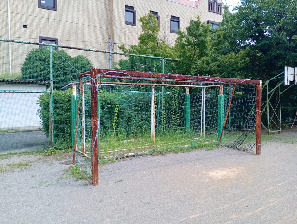 赤茶色のサッカーゴールや朽ちたバスケットゴール、使用禁止となった登り棒などがあります。