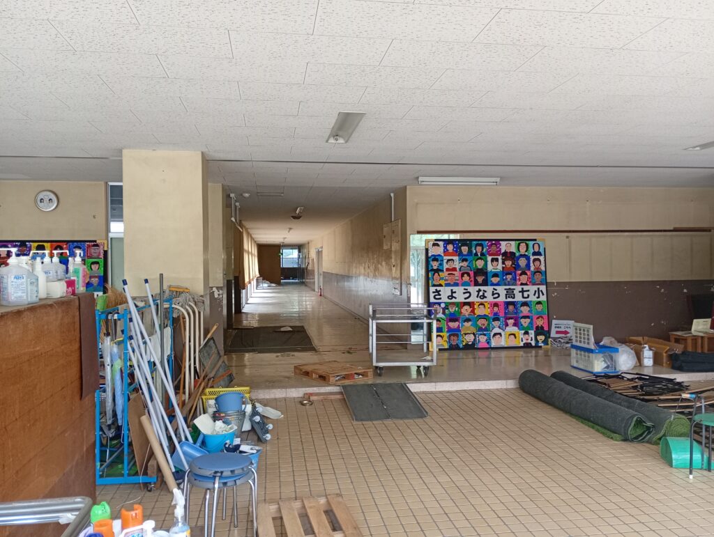 校舎はがらんとしています。カーテンは経年劣化もありビリビリになってしまっていますが、先日の棟下げ式にて校舎に入られて頂きましたが、しっかりとした作りで掃除もきちんとしているので、内部は備品を入れれば授業ができそうな雰囲気があります。