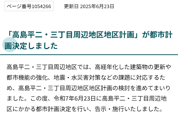 高島平の再開発に係る都市計画ですが、所定の手続きを経て2025年6月23日にて告示・施工されました。
