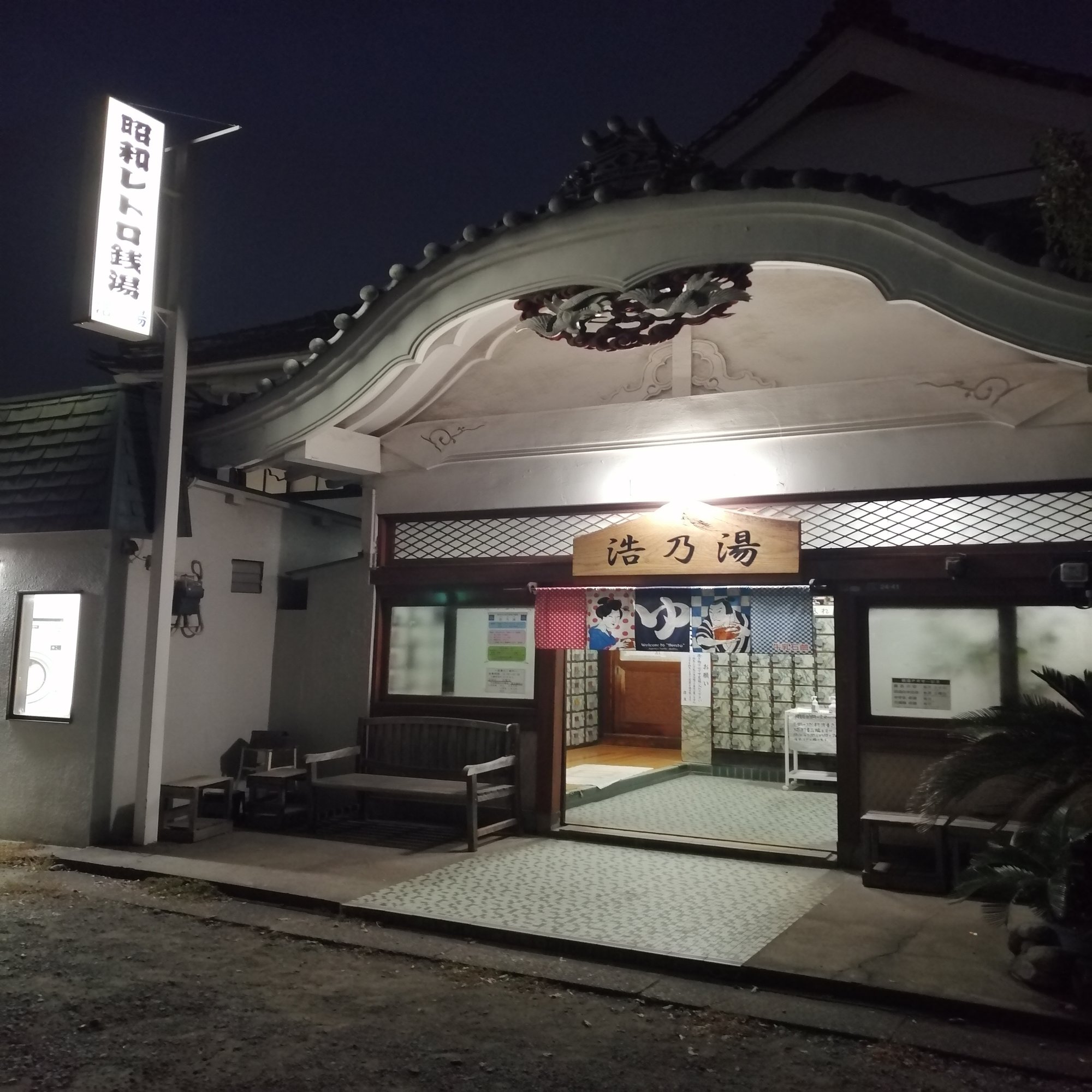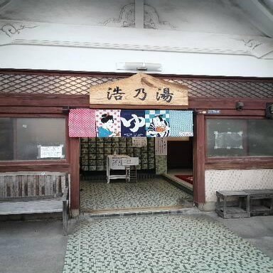 すごい立派な建物です。煙突には浩乃湯の文字がありますね。入口は今どき貴重なレトロな風情です。