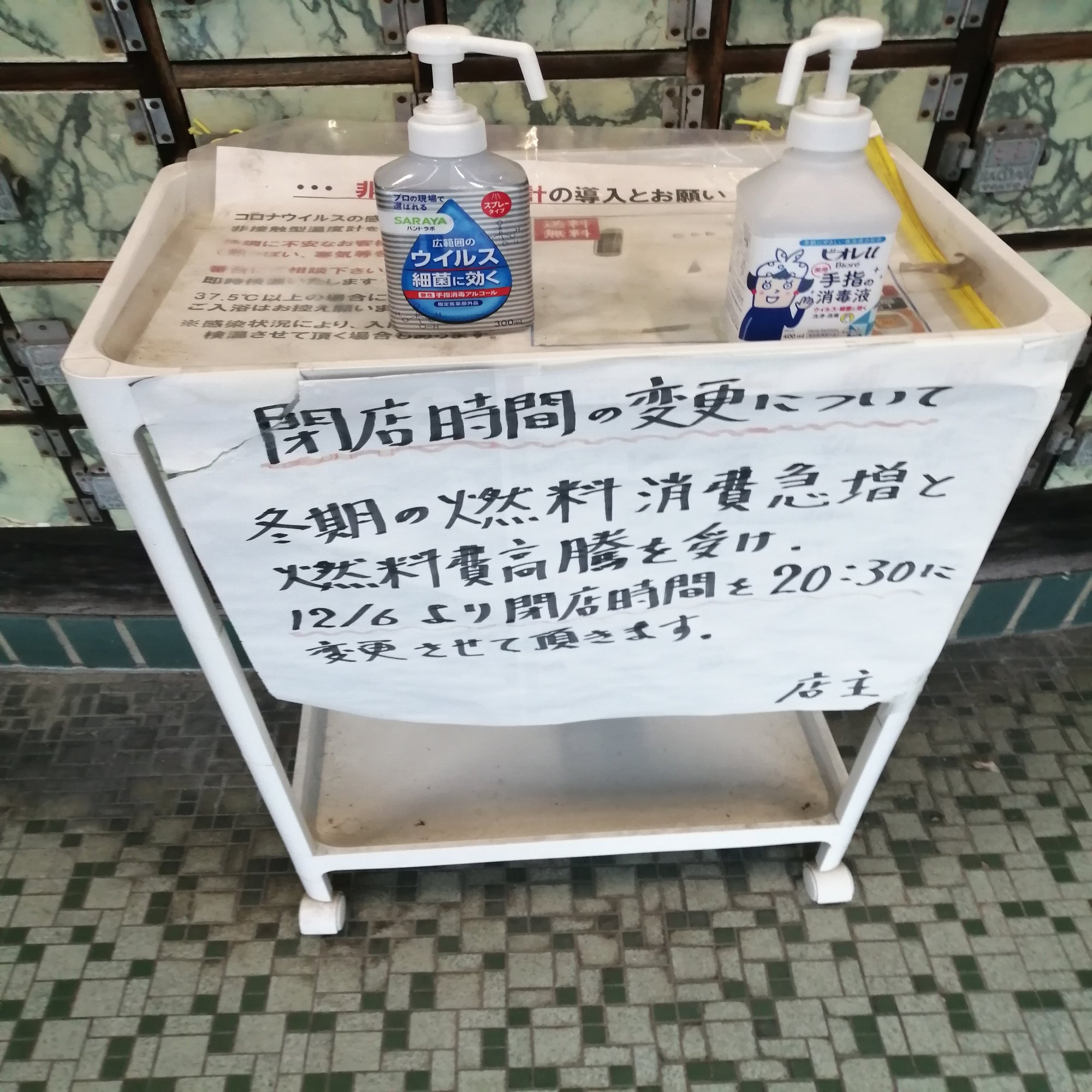 浩乃湯さんは廃材を薪に使って燃料費の高騰に対処しているそうですが、流石に燃料費が上がりすぎてしまったので、時短営業を始められたそうです。