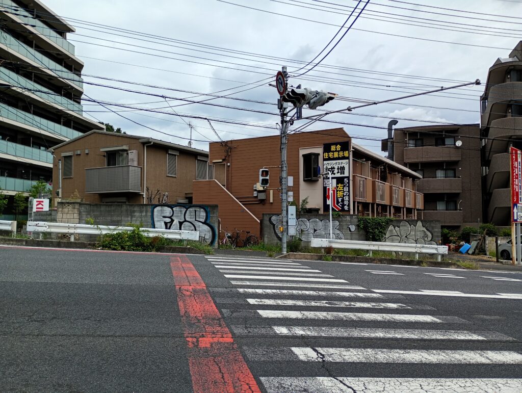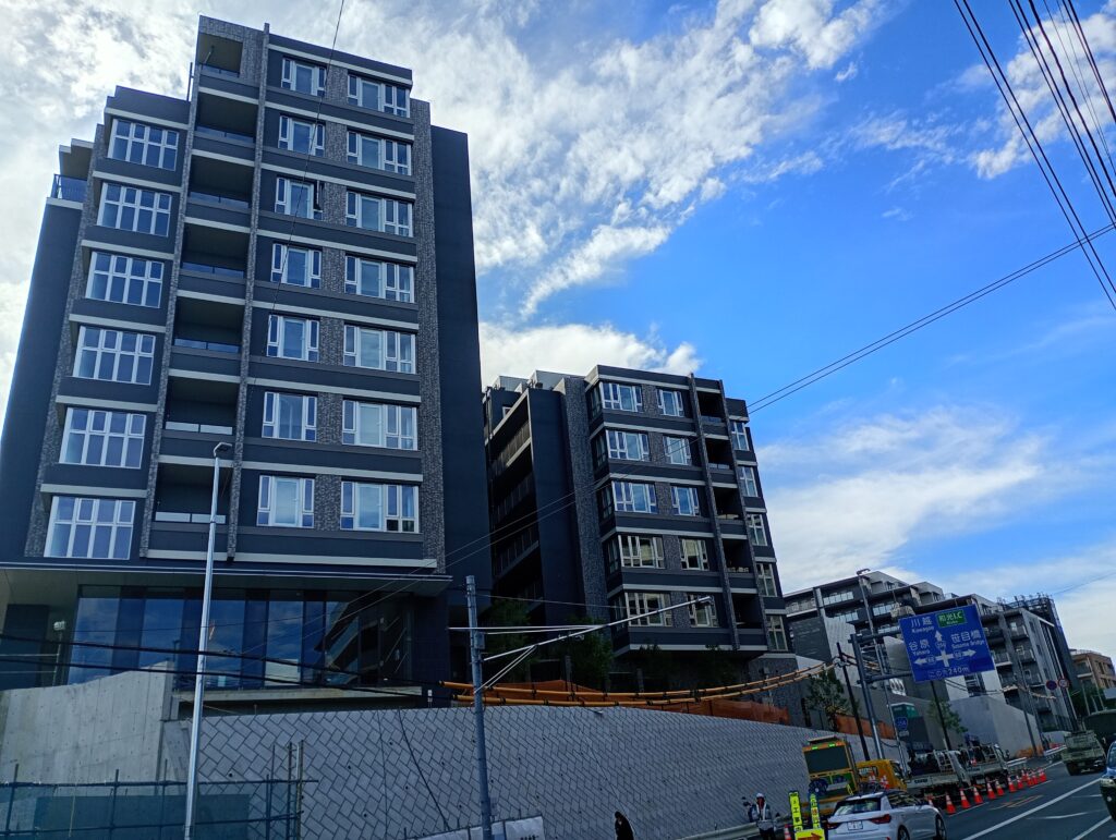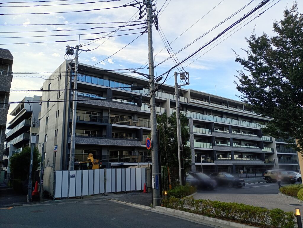 マンションの裏手にも行ってみました。坂の下からみるとすごい背が高い建物のように感じますが、坂の上からみると周囲に背の高いマンション群があるのでそんなに高い感じはしないのですね。