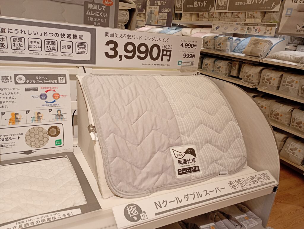 7月に入り梅雨も開けきらぬうちから夏の暑さが厳しくなってきたので、夏の夜を快適に過ごすために「Nクールダブルスーパー」3,990円を見に来ました。これ一つあるとだいぶ寝やすくなりますよね。