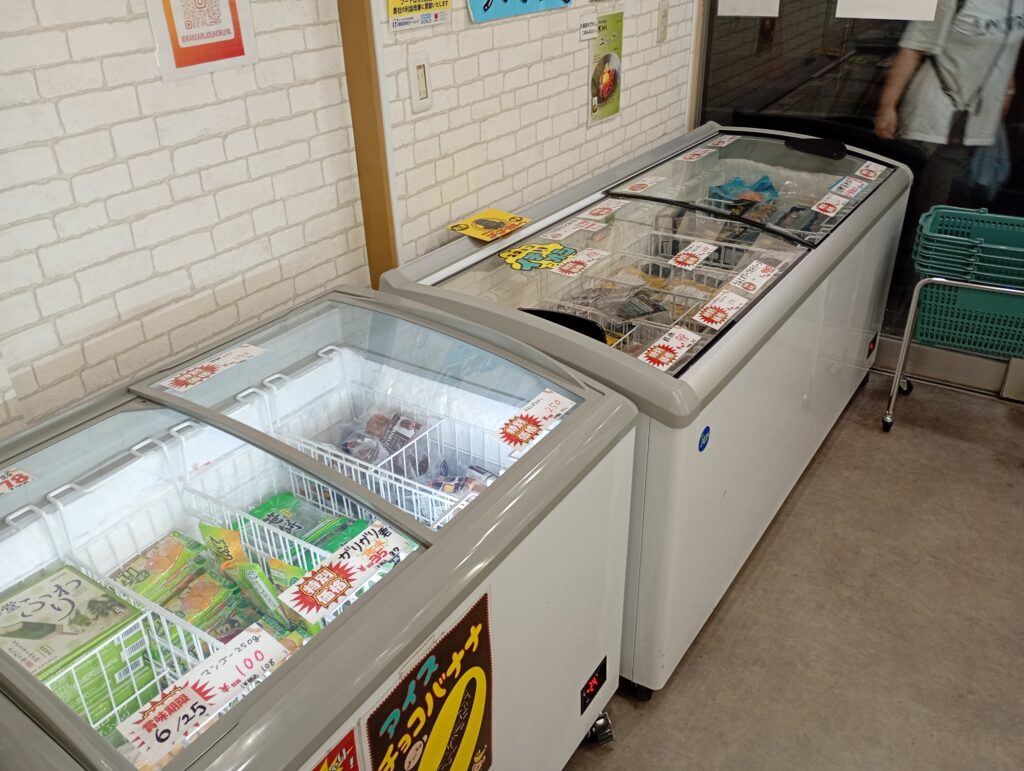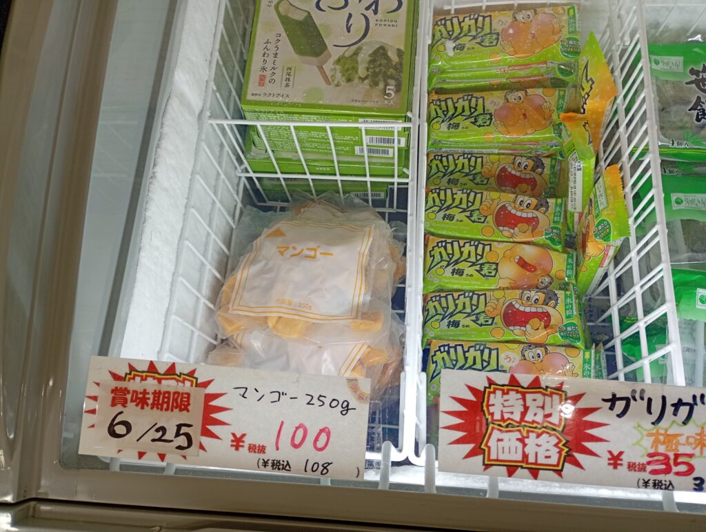 背の低い冷凍ケースも有り、こちらは海鮮やスイーツ系が入っていることが多いです。冷凍マンゴー250グラム100円!?思わず、4つ買ってしまいました。