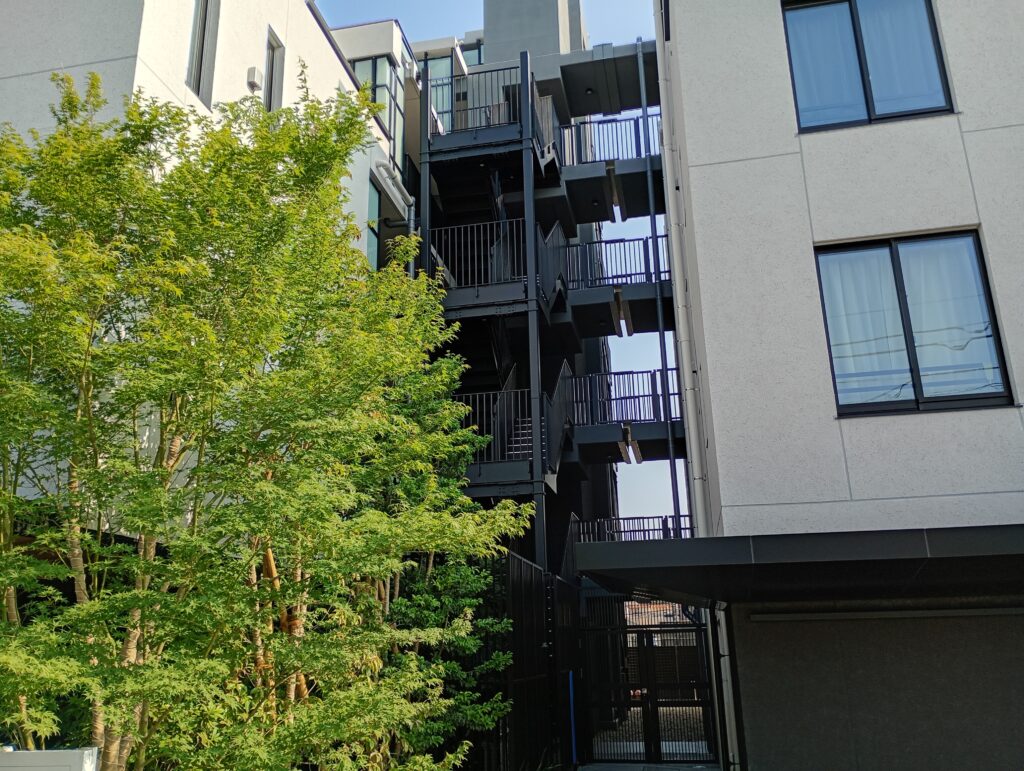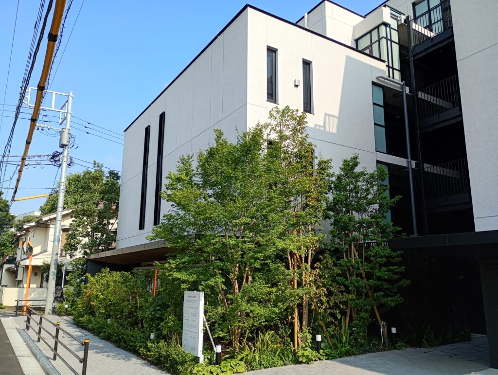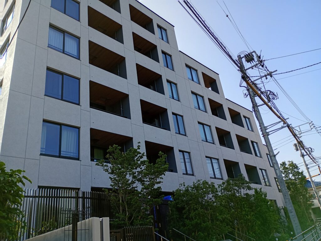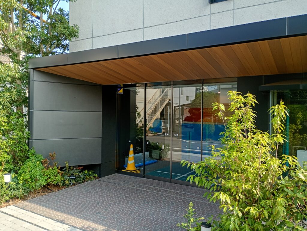 エントランスは木材が使われたラグジュアリーな外観となっています。7月上旬には入居が始まっており、引っ越し用の青いシートが貼られていました。