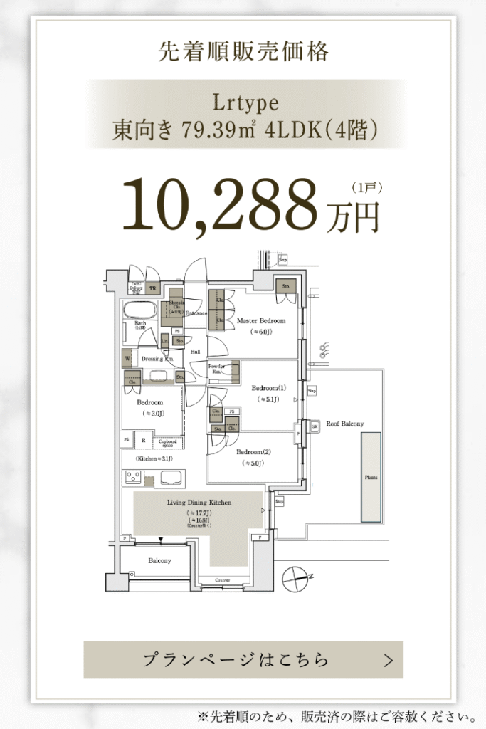 分譲価格についてですが、ハーフバルコニー付きの79.39㎡の部屋が最後の一戸として販売されていますが、価格は10,288万円となり、億ションとなっています。坪単価は420万円ですね。