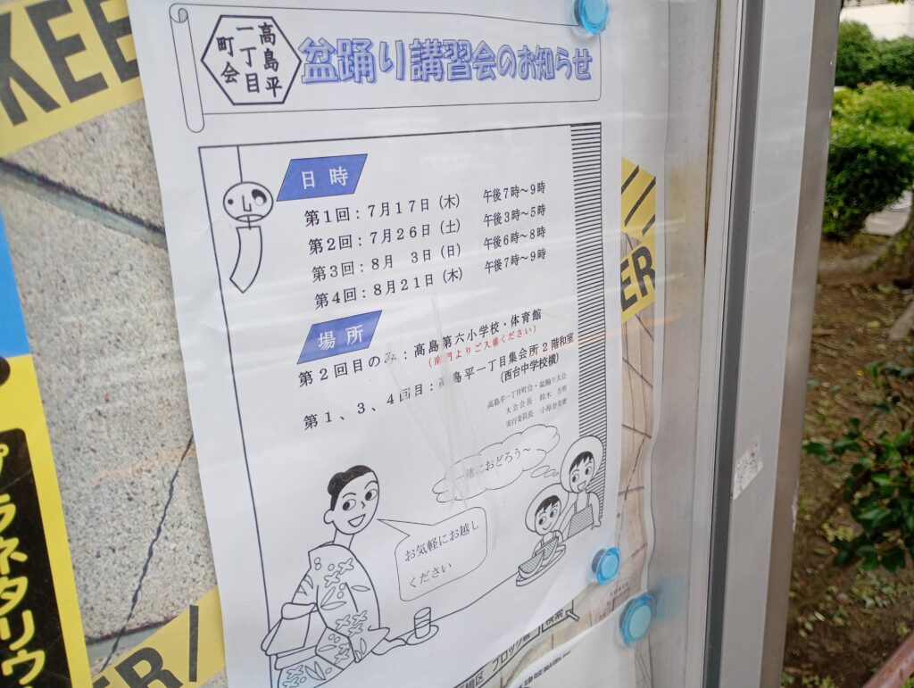高島平一丁目の盆踊りが2025年8月23、24日の週末の土日で開催されるそうです(毎年8月下旬の土日)。最近は7月中に開催する地域も多いので、お盆の後の裏盆の時期に開催してもらえるのもありがたいですね。