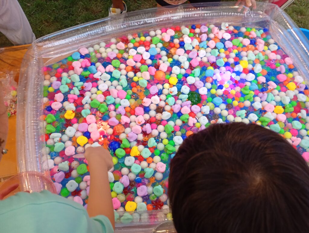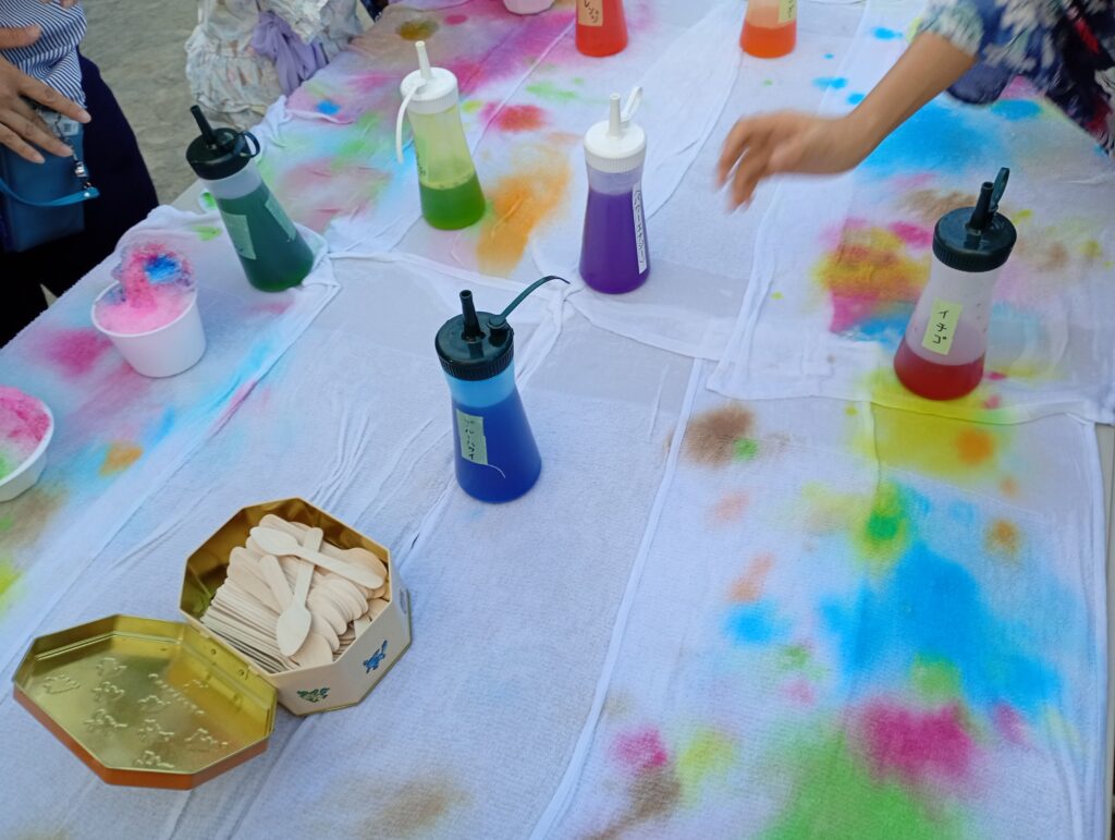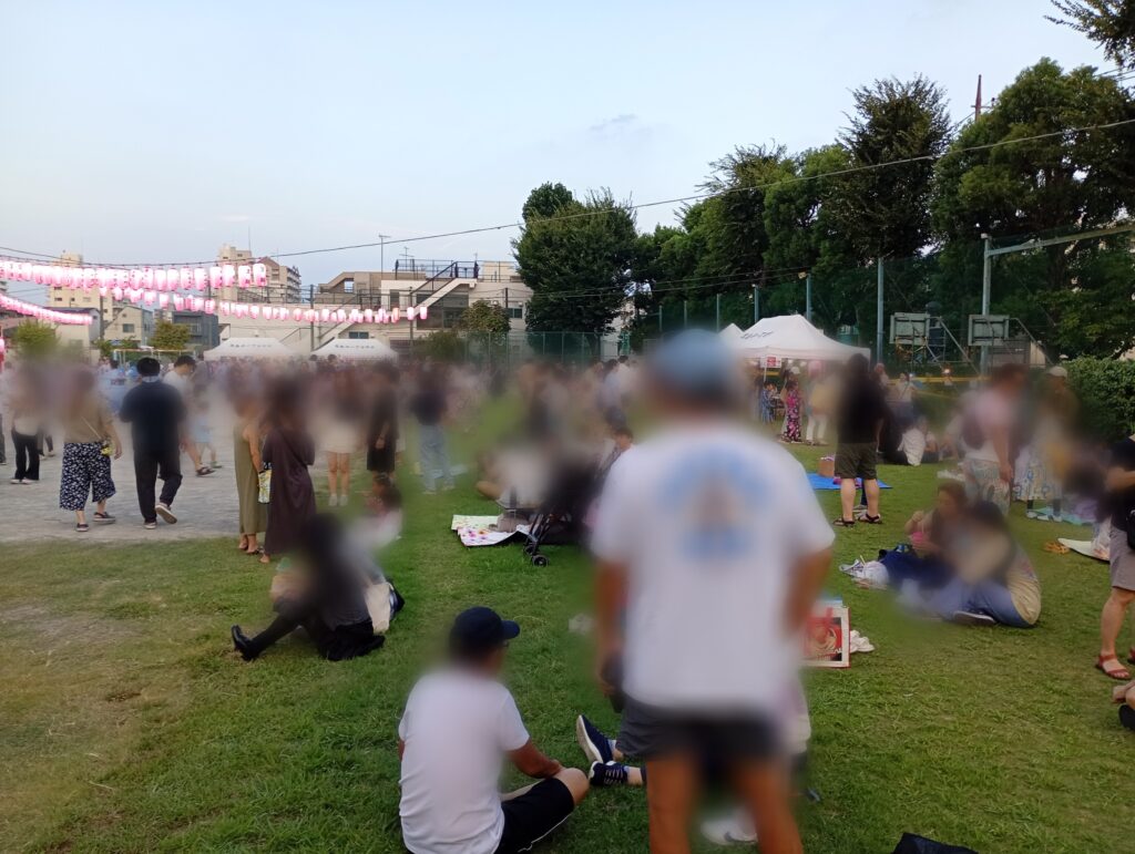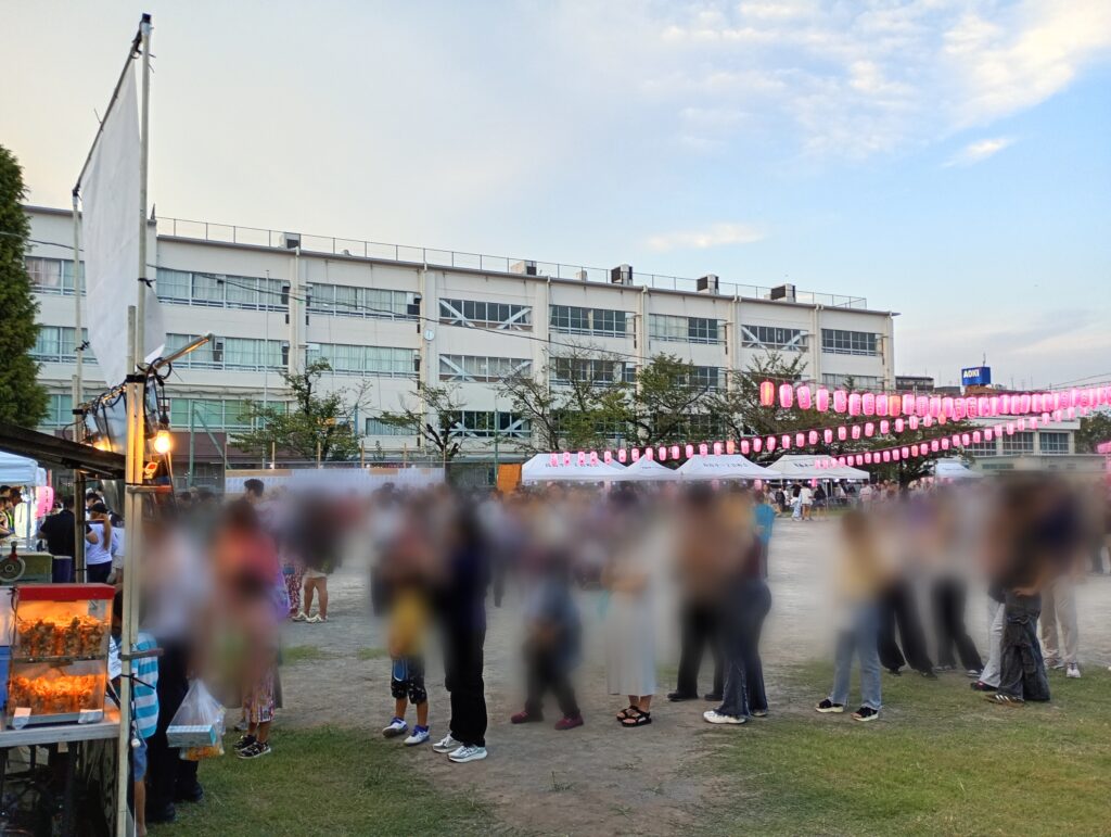 当日はグラウンドに櫓が立ち太鼓の音が響いていました。スーパーポールすくい200円やかき氷200円、焼きそば300円、ポップコーン100円などが出ていました。校庭の外や近隣のお店の前にも屋台があり、活気のあるお祭りでした。