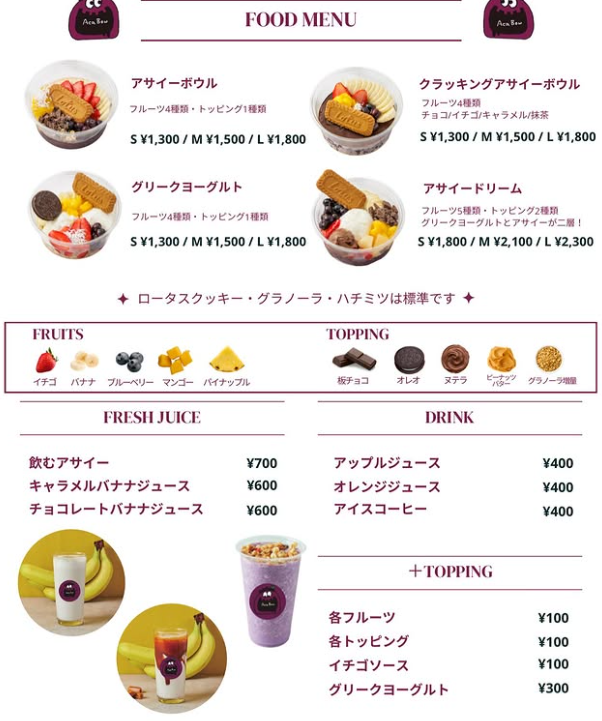 アサイーボウルもフレッシュジュースもおいしそうですね。