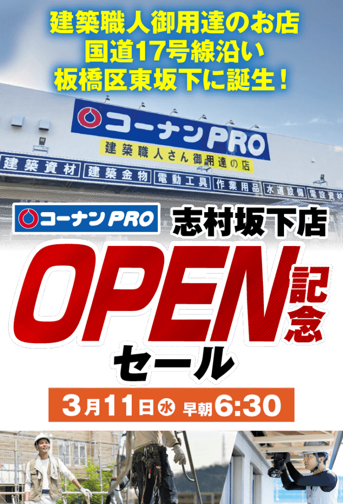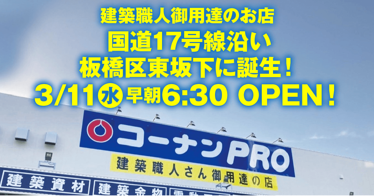 2026年3月11日に志村坂下駅から中山道を新河岸川方面に進んだところに「コーナンPRO板橋志村坂下店」がオープン予定です。