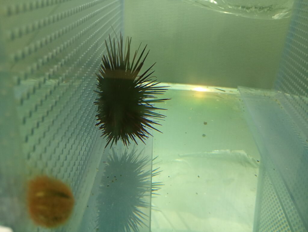 二階に上ると水槽があり、生きたウニが展示されていました。こちらはムラサキウニですね。