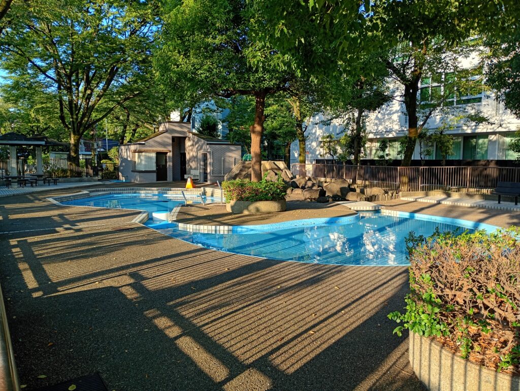 夏場はじゃぶじゃぶ池で水遊びができます。周囲に木立があるため、日差しが強い日も遊べます。