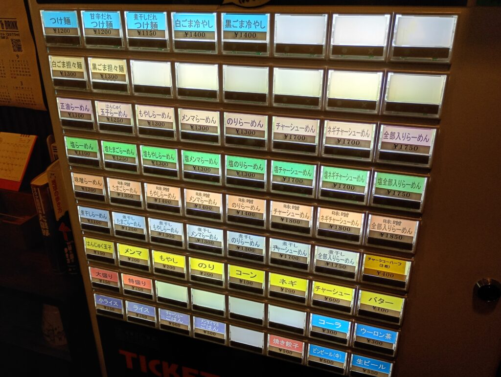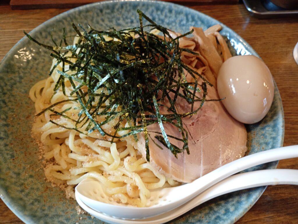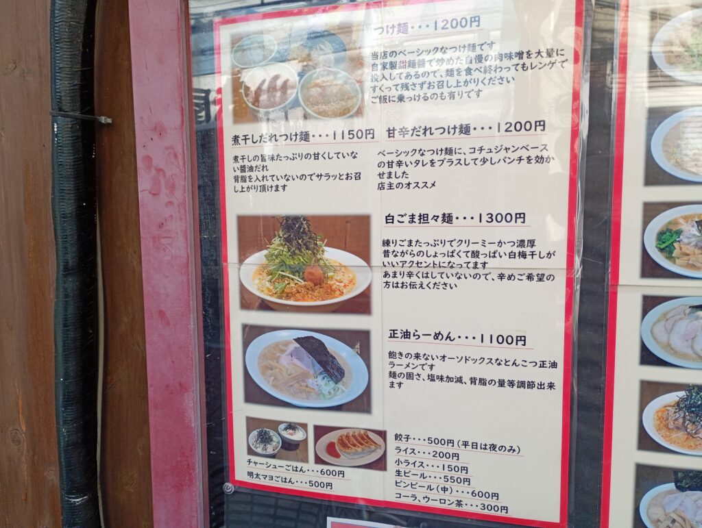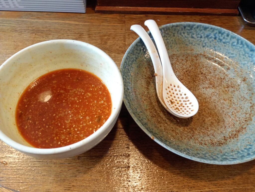 入口を入ると右手に食券機があります。つけ麺がおいしいとの口コミを見ましたが、醤油ラーメンや担々麺もおいしそうだな~と、なににしようか迷っていました。すると、オーナーが声を掛けて下さり、暑い時期はつけ麺、特に甘辛つけ麺がオススメとのことでしたので、甘辛つけ麺1,200円を注文してみました。