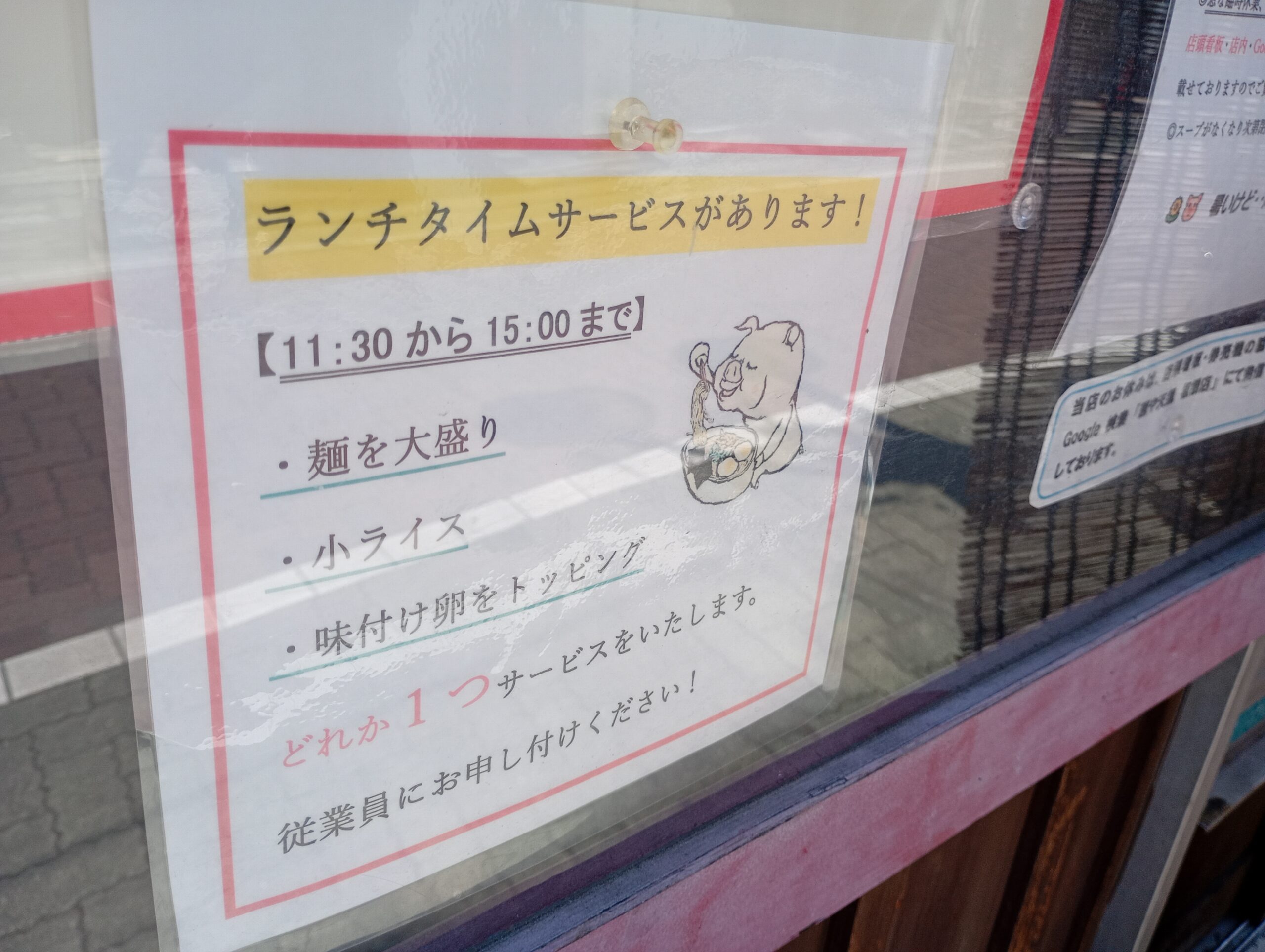ランチタイムには、麺の大盛り、小ライス、味付け卵の中から1つ選べるサービスがあり、お得感がある点も魅力です(味付け卵を選んでみました)。