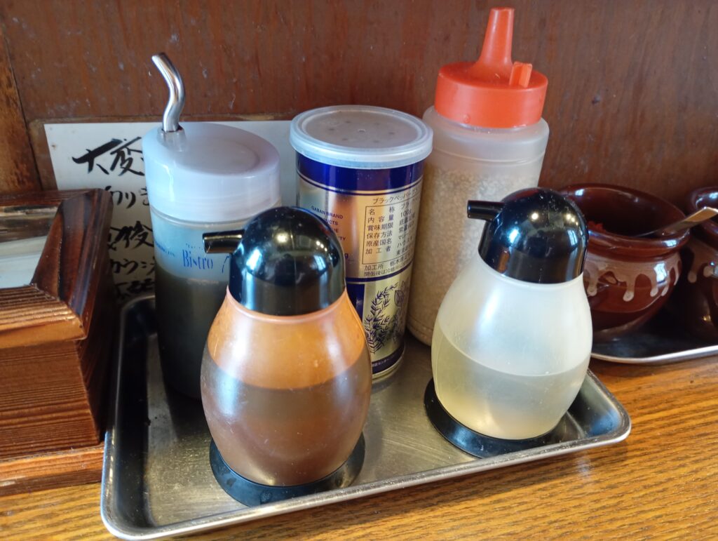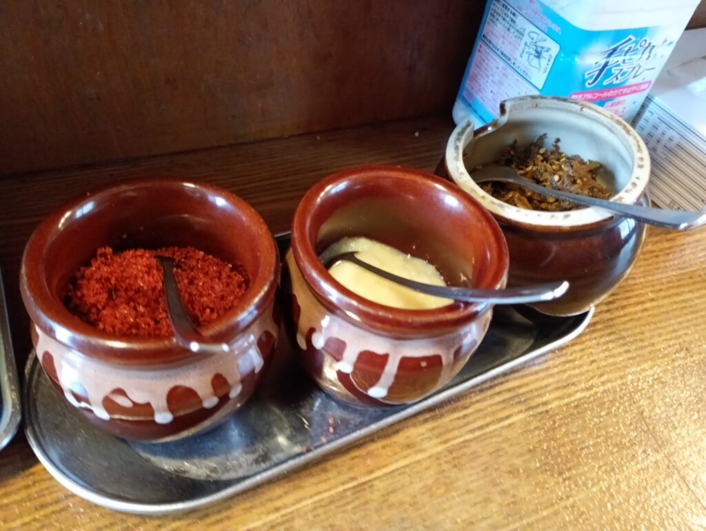 餃子用の醤油やお酢、また、ラーメンに加える唐辛子、にんにく、高菜がありました。