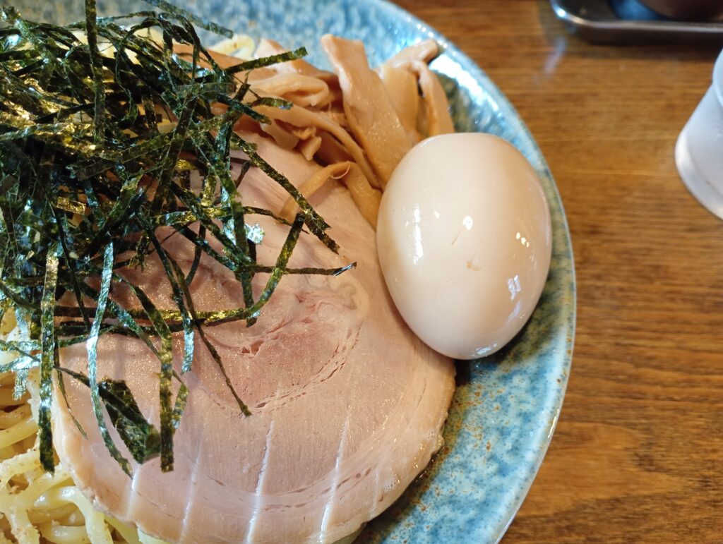 トッピングは卵とチャーシュー、メンマと海苔が乗っています。卵はランチサービスでつけて頂きました。