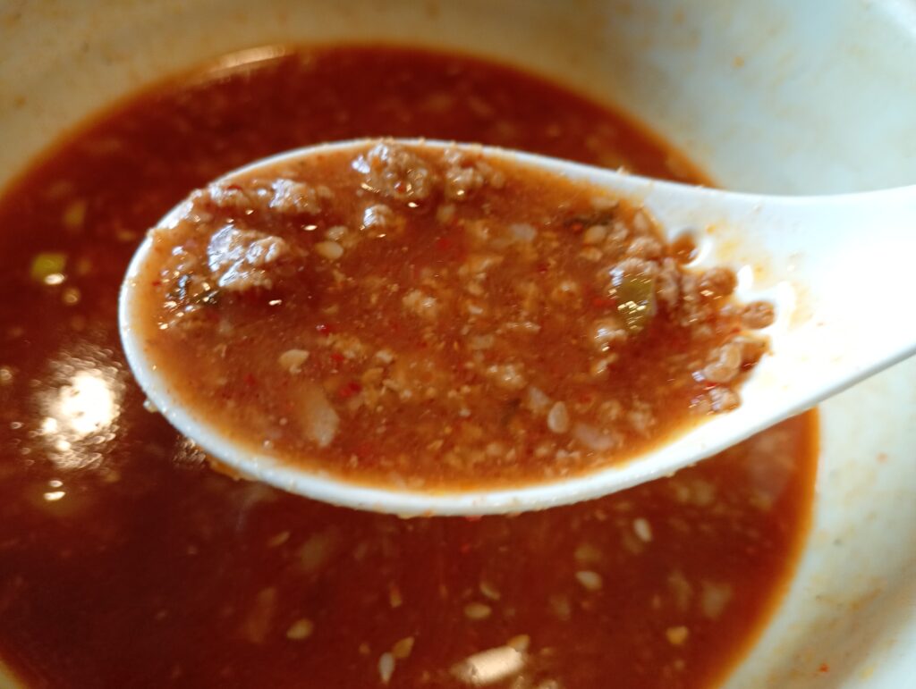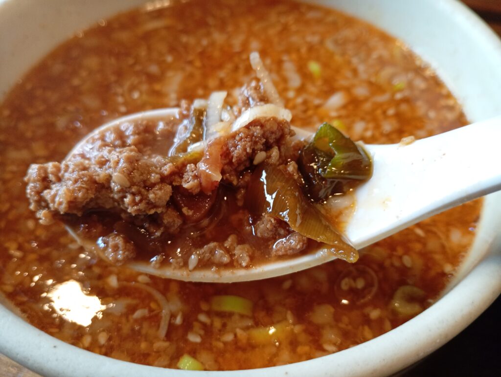濃厚でありながら、こってりしすぎていない豚骨スープをベースに、挽肉入りの味噌味のタレの組み合わせが絶妙と評判です。レンゲですくうと肉味噌がたっぷりはいっていることがわかります。オーナーは中華で修行をされていた経験もあり、肉味噌にはこだわりがあるそうです。