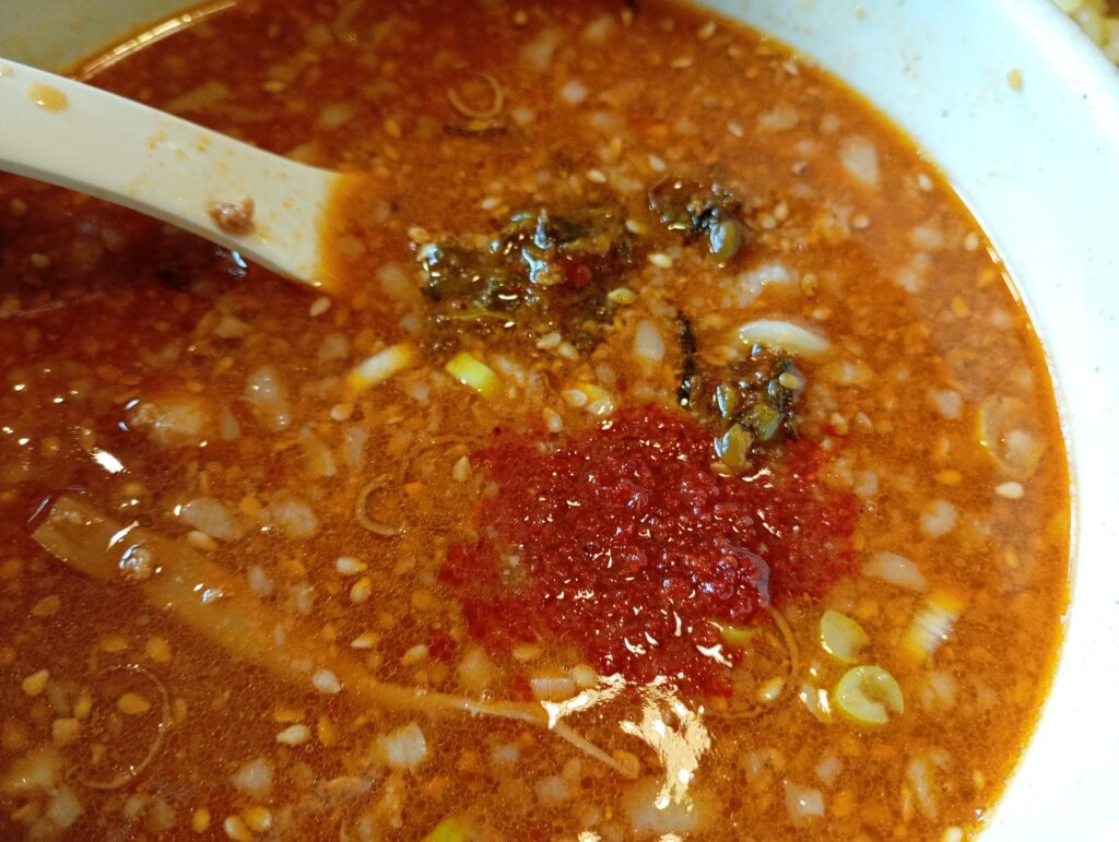少し食べてから味変のために唐辛子、にんにく、高菜を入れてみました。甘辛つめけんですが、もともとの味はそんなに辛くないので、辛党の方はドバドバ唐辛子を入れても良いかもしれません。