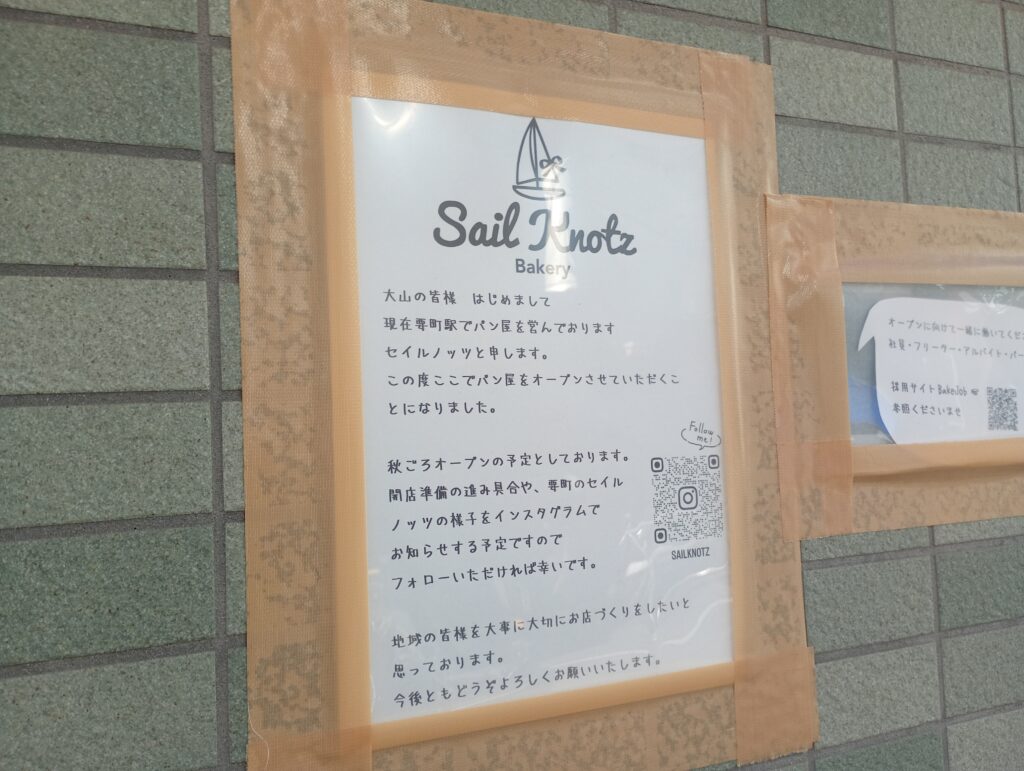 Sailknotzさんですが、大山の遊座大山商店街に2025年秋頃に2店舗目を出店されるそうです(山口花店さんの跡地になります)。店員さんにお話をお伺いしましたが、パンの種類は要町と概ね同じような商品が並ぶとのことで、人気のデニッシュなどが大山でも購入できるようになるそうです。