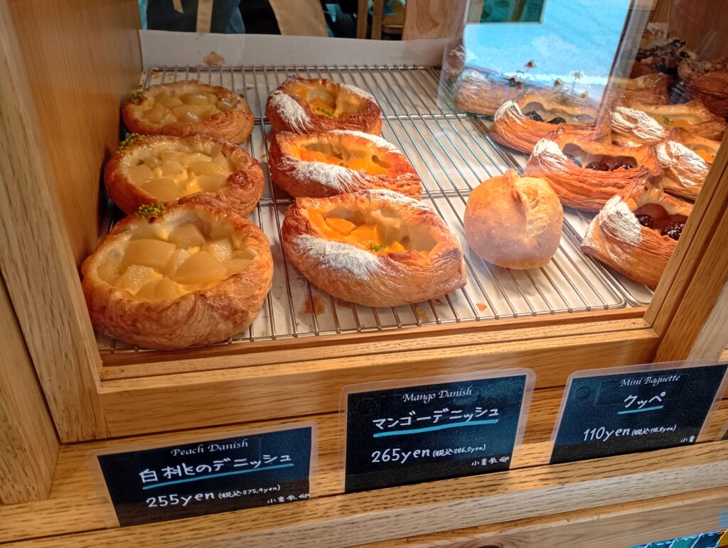 チェリー、オレンジ、白桃、マンゴーといったデザート系の甘いデニッシュから、アンチョビキノコといったものまで、様々なデニッシュがケースの中に並んでいます。どれにしようか悩んでしまいます。