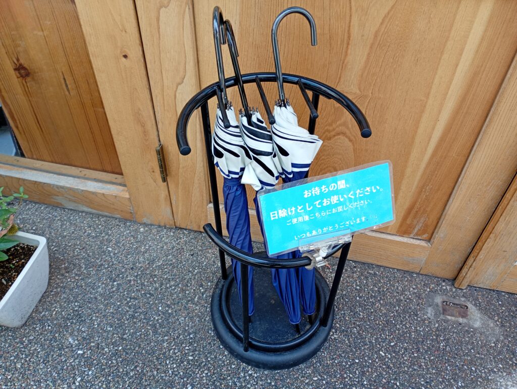 店内に入れる人数は3組までと制限されているのですが、そのため外で待つことにある方々のために日傘がおいてあります。場所的に午後になると店頭も日差しがきついので、こうした心配りはありがたいですね。