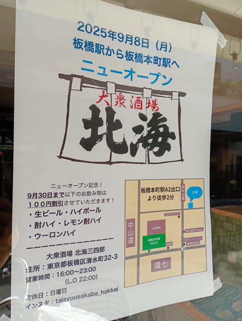 2025年9月8日㈪に惜しまれながら閉店した「大衆北海」さんが板橋本町にてオープン予定となります。