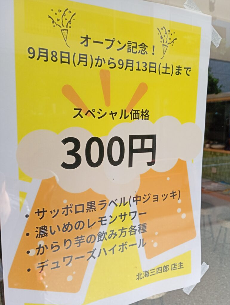 後日再訪すると、オープンが9月8日㈪であり13日㈯まではビールやサワーなどが300円で提供されはそうです!是非足を運ばれてみてはいかがでしょうか。