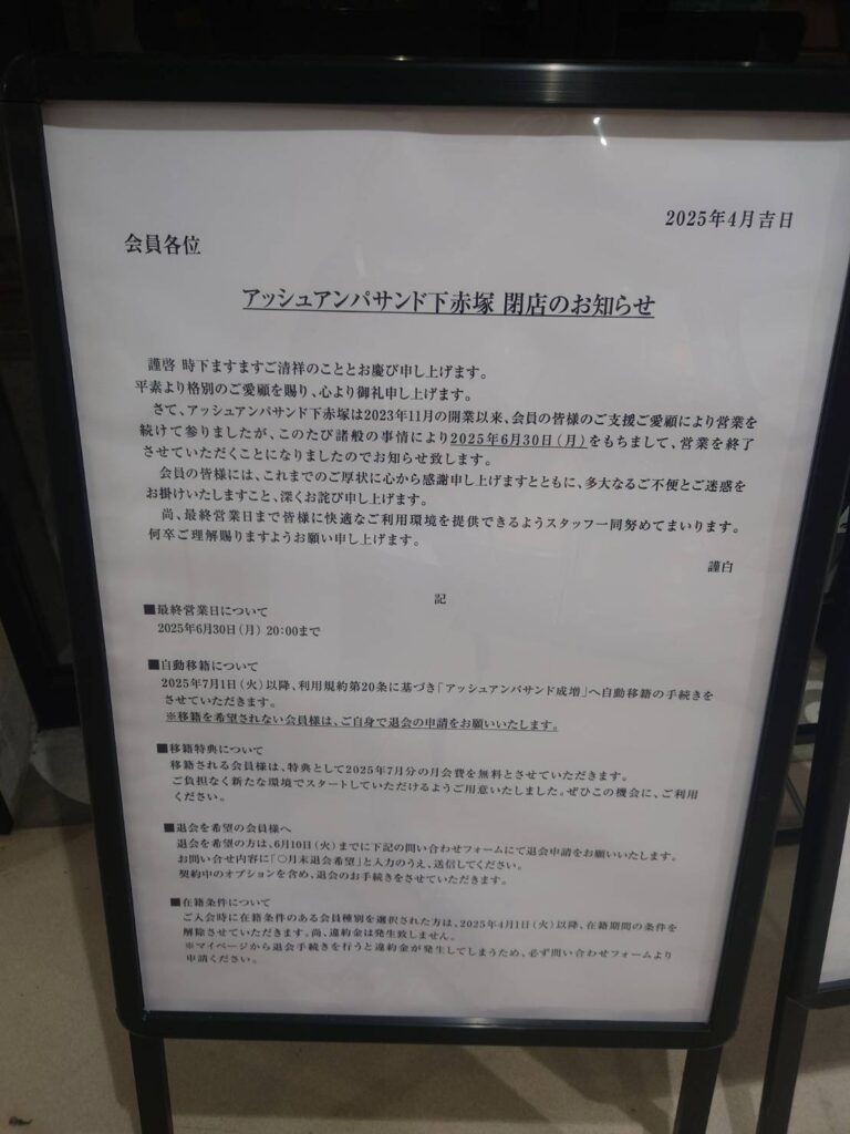 現在、アッシュアンパサンド下赤塚店をご利用の会員は、利用規約に基づき2025年7月1日(火)以降、自動的に「アッシュアンパサンド成増」へ移籍手続きがされるそうです。