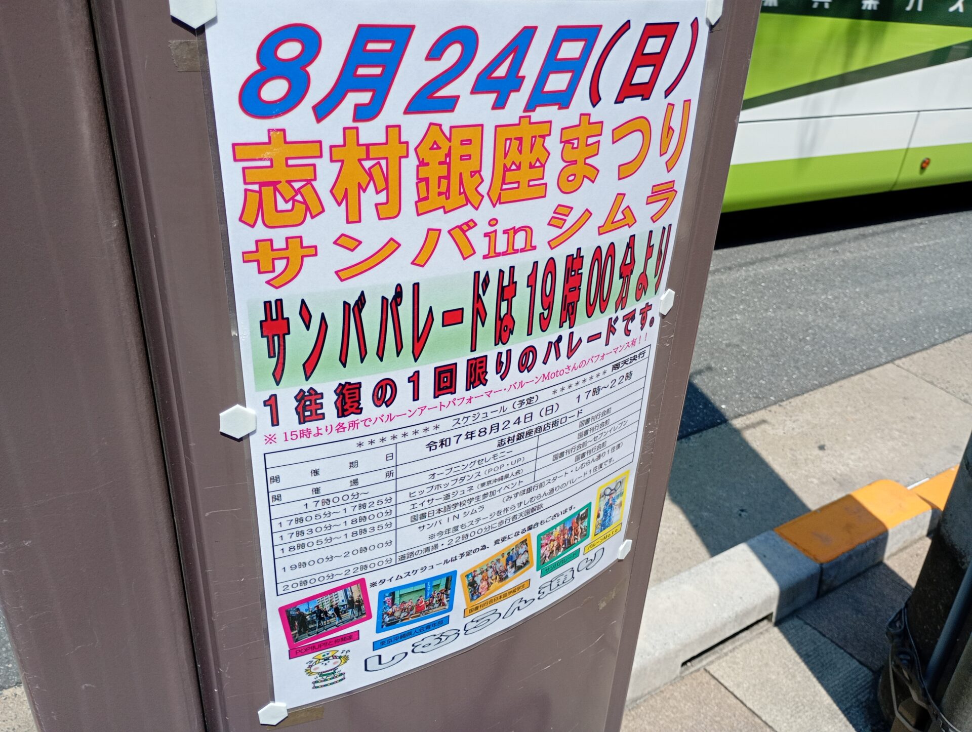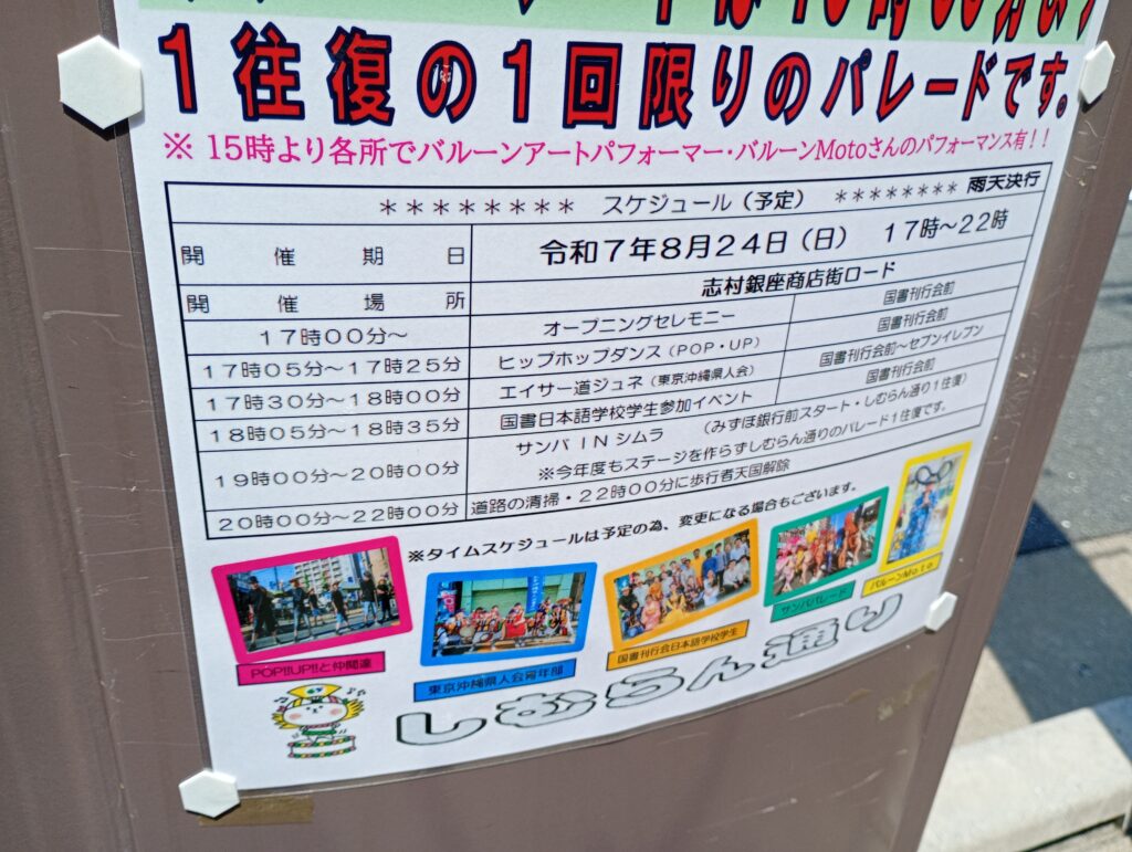 スケジュールでは、17時からオープニングセレモニーが行われ、その後「ヒップホップダンス(POP・UP)」さん、「エイサー道ジュネ(東京)沖縄県人会」さんの演舞、また、「国書日本語学校学生参加イベント」が18時35分まで国書刊行会前周辺が続きます。