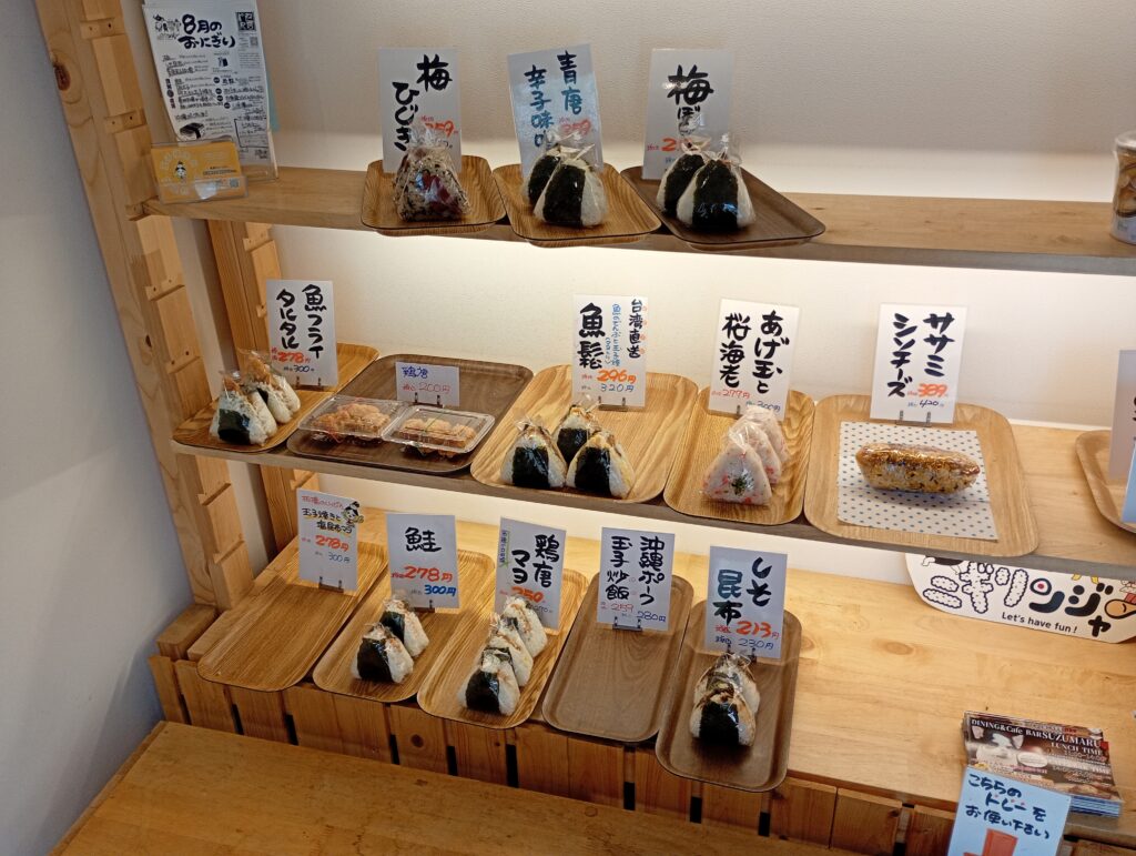 店内に入ると右手に棚があり、様々なおにぎりが陳列されています。一日400個以上のおにぎりを作るそうです。